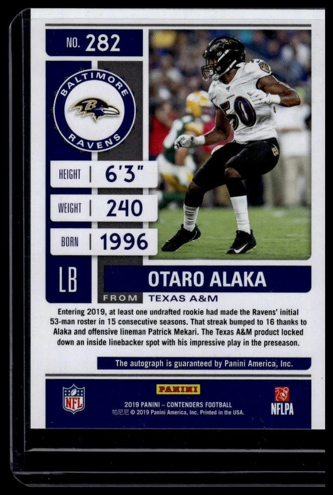 This is a nice example of a 2019 Panini Contenders #282 Otaro Alaka Playoff Ticket.Other important information about this card: SN,RC,AUIn 2019 Otaro Alaka played for the Baltimore Ravens.Please check out our other listings for more great cards. Shipping can be combined! First card is $1.25 - each additional card is $0.50. Up to 2 cards will be toploaded, additional cards won/paid for will be in a penny sleeve. Thank you for your business!