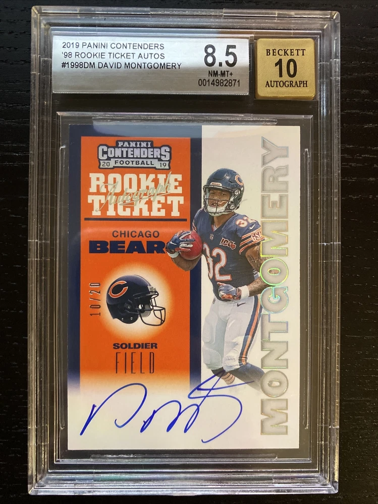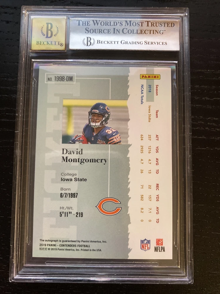 Autograph Authentication: Beckett Authentication Services (BAS) Season: 2019 Autograph Format: Hard Signed Set: 2019 Panini Contenders Type: Sports Trading Card Manufacturer: Panini League: National Football League (NFL) Graded: Yes Features: Limited Edition, Parallel/Variety, Rookie, Serial Numbered, Short Print, NFL Sport: Football Player/Athlete: David Montgomery Autographed: Yes Grade: 8.5 Team: Chicago Bears Signed By: David Montgomery Professional Grader: Beckett Grading Services (BGS)
