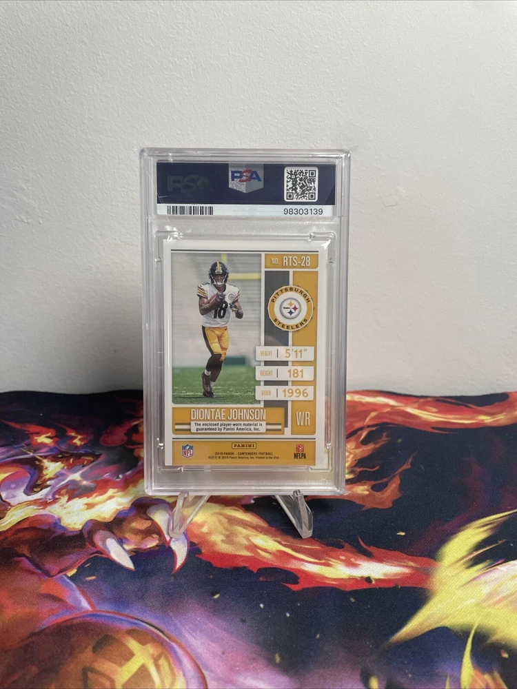 This 2019 Panini Contenders sports trading card features Diontae Johnson, a rookie player in the National Football League (NFL). The card number is RTS-28 and it has been professionally graded by the Professional Sports Authenticator (PSA) with a grade of 10. The card is part of the 2019 set and has several desirable features, including a swatch of Johnson's game-worn jersey. This card is perfect for avid collectors of sports memorabilia and fans of the NFL. It is a must-have for any collector looking to add a rare and valuable card to their collection. Don't miss out on the opportunity to own this highly sought-after card.