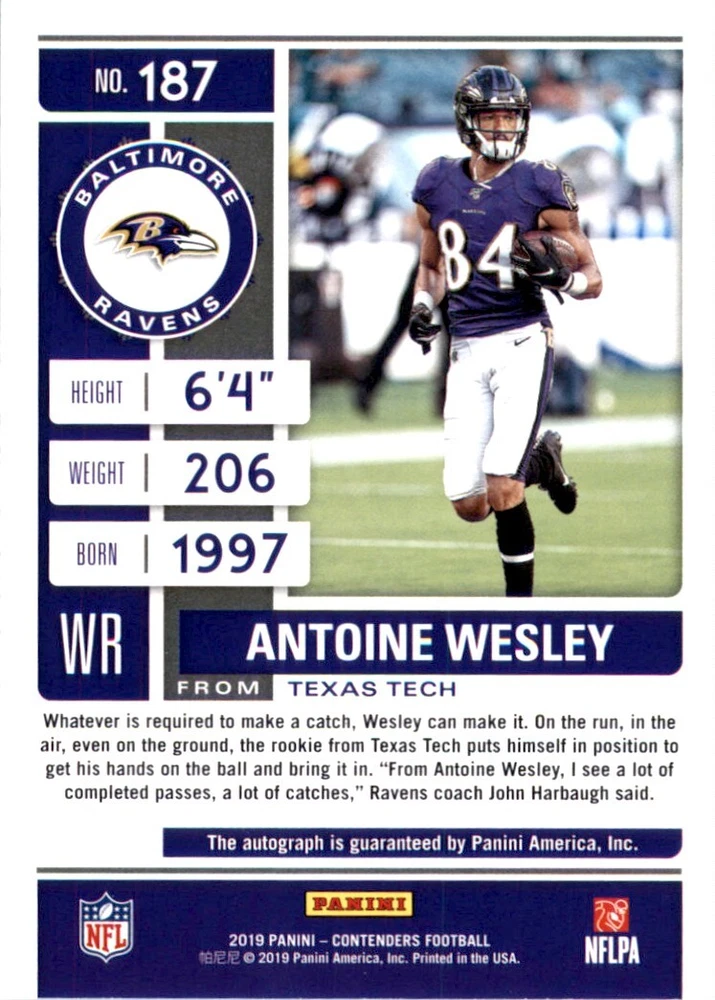 League: National Football League (NFL) Season: 2019 Player/Athlete: Antoine Wesley Autographed: Yes Print Run: 49 Sport: Football Series: Panini Contenders Card Number: 187 Manufacturer: Panini Additional Description: Rookie Ticket - Antoine Wesley brand: Panini Subset: Rookie Ticket Team: Baltimore Ravens Parallel/Variety: Championship Ticket Features: Serial Numbered, Parallel/Variety, Base Set, Rookie Set: 2019 Panini Contenders