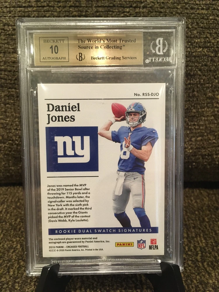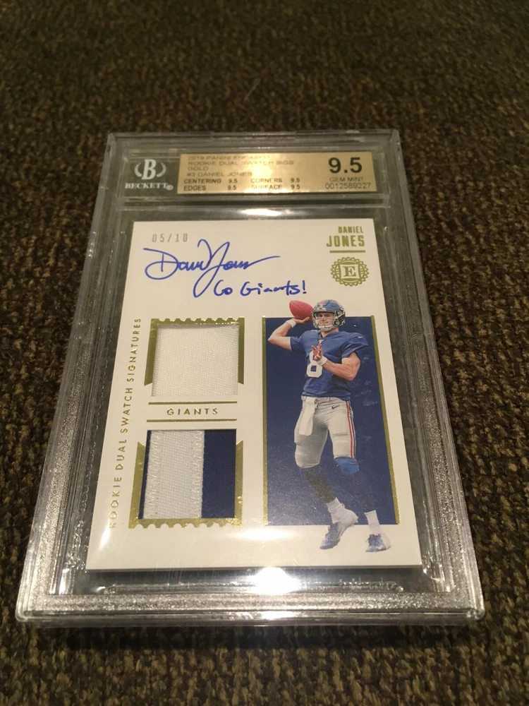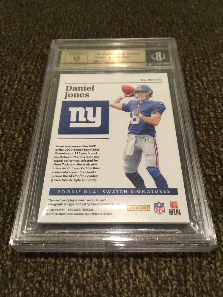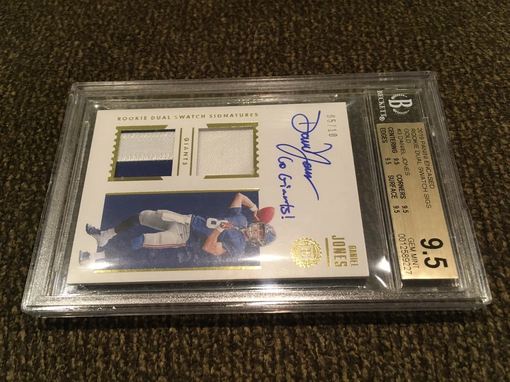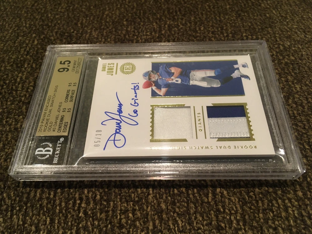 FOR SALE IS A 2019 PANINI ENCASED DANIEL JONES ROOKIE ENDORSEMENTS GOLD VERSION CARD SP JERSEY # 8/10 GRADED BGS 9.5 GEM MINT WITH 10 AUTOGRAPH. BGS SERIAL # 0011905946. SUPER FAST SAME DAY USPS SHIPPING WILL BE $4.95