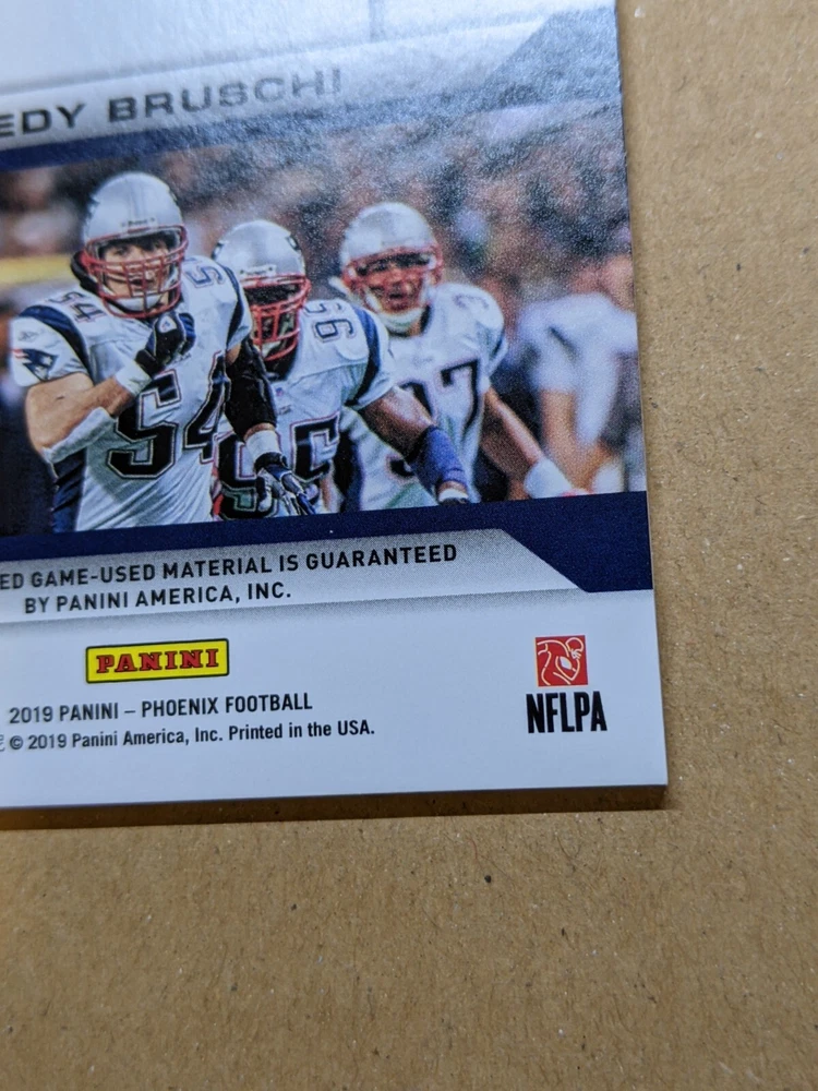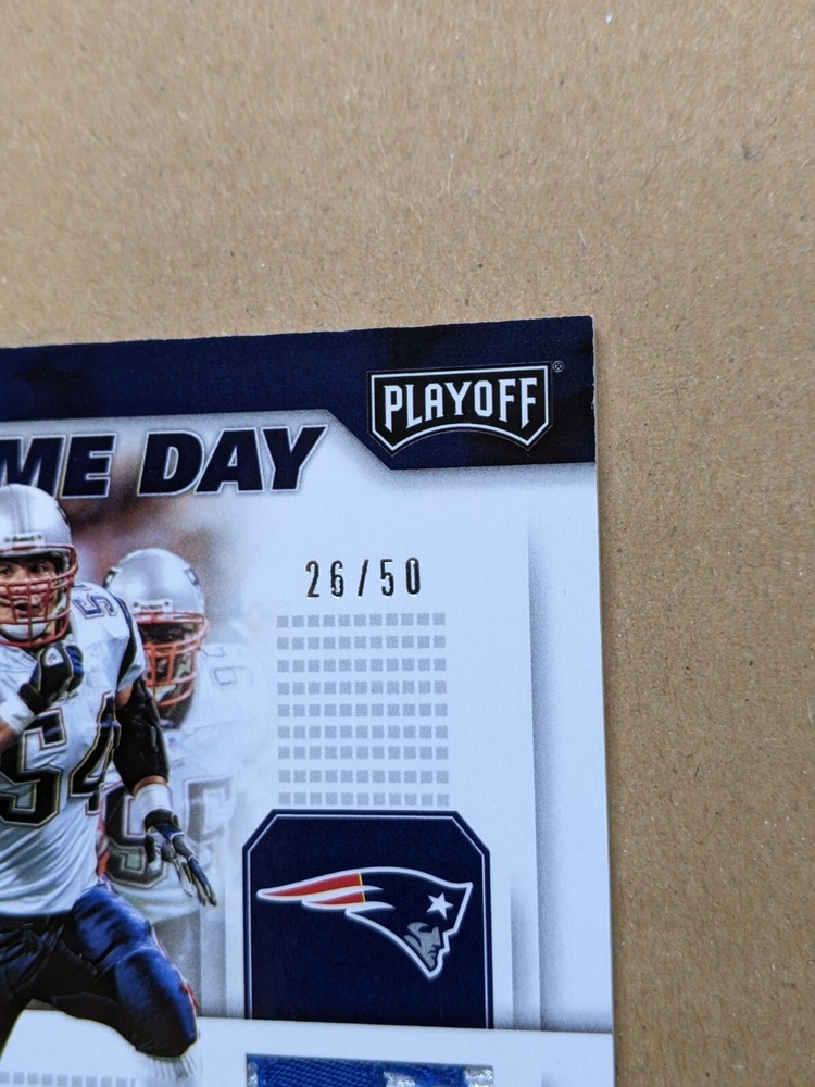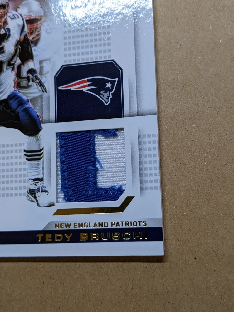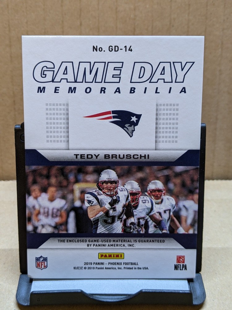 2019 Panini Playoff Tedy Bruschi Game Day Memorabilia Prime #26/50. Game-worn jersey patch from what looks like the uniform nameplate. See photos for condition details. U.S. shipping is $5.00 for the first item and $1.00 for each additional item. International shipping is handled by the eBay International Shipping program and will be calculated at time of checkout. Check out my other listings for more rare Patriots cards.