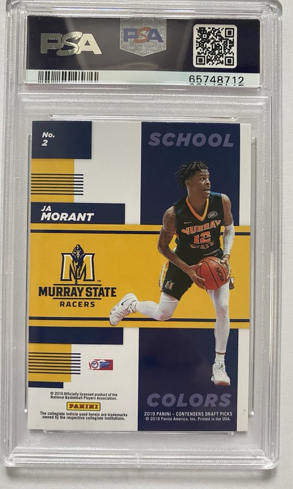 This 2019 Panini Prizm Draft card features Ja Morant, a top basketball player and athlete. The card is a trading card and is part of the 2019 Panini Prizm set. It is a rookie card with the card number 44. The card has been professionally graded and received a PSA 10 GEM MINT rating.