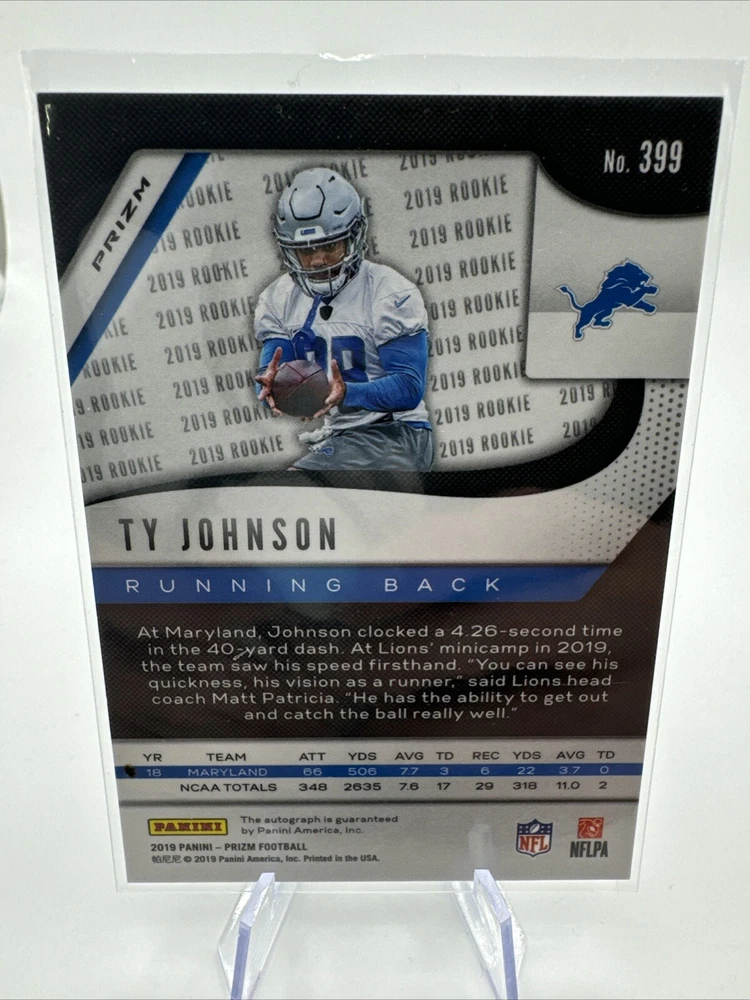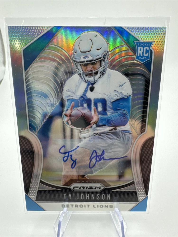 Sport: Football Features: Rookie, Parallel/Variety, Box Topper, Chase, Checklist, Collectors Edition, Exclusive, Hologram, Insert, Limited Edition, Short Print Manufacturer: Panini Type: Sports Trading Card Player/Athlete: Ty Johnson Parallel/Variety: Silver Prizm League: National Football League (NFL) Team: Detroit Lions Set: 2019 Panini Prizm Card Number: 399 Autographed: Yes Season: 2019