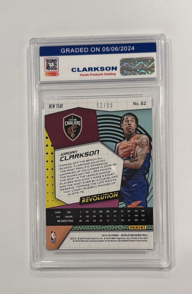 This is a 2019 Panini Revolution trading card featuring Jordan Clarkson of the Cleveland Cavaliers. It is a Chinese New Year Emerald parallel variety, graded as a 10. The card is from the 2019-20 Panini Revolution set, with a print run numbered to 88. The card showcases Clarkson in his Cavaliers uniform and is professionally graded.