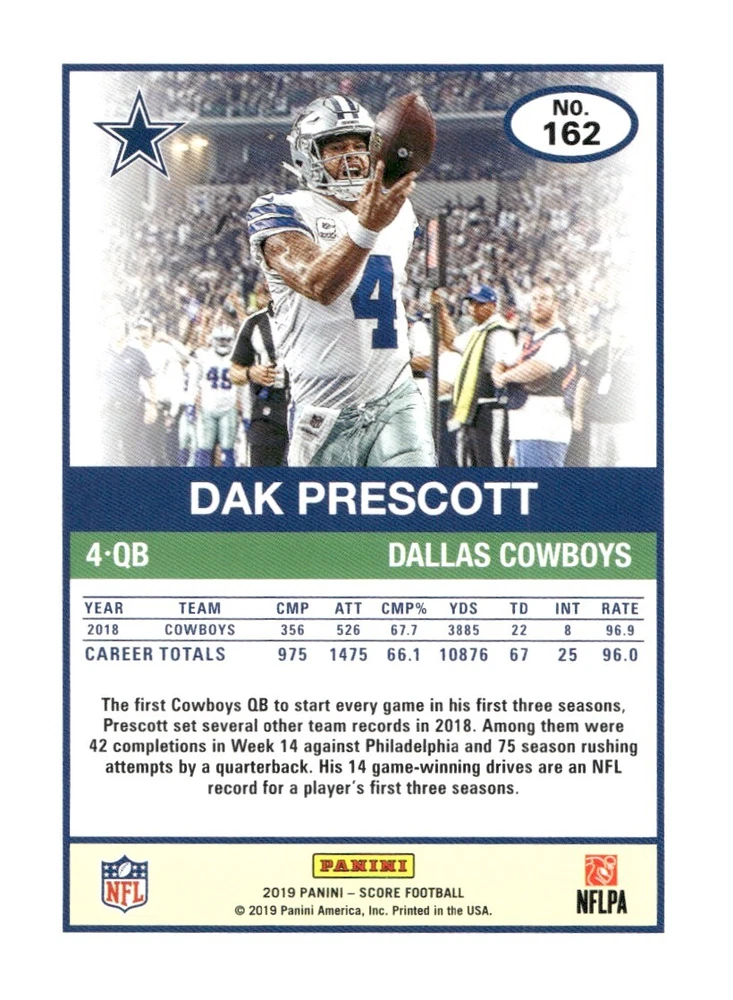 About Me Other Listings Feedback Add to Favorites Contact Me eBay Store JEm_Mint_Trading 2019 Score Dak Prescott Dallas Cowboys #162 No stock photo / These are real scans or pictures Details Description: Dak Prescott Category: Football Year: 2019 Product: Score Team: Dallas Cowboys Card Number: 162 Dimensions: 3½" x 2½" SKU: FT A0005 R02 D (23) Listing By Kronocard trading cards software v2.8.1.2