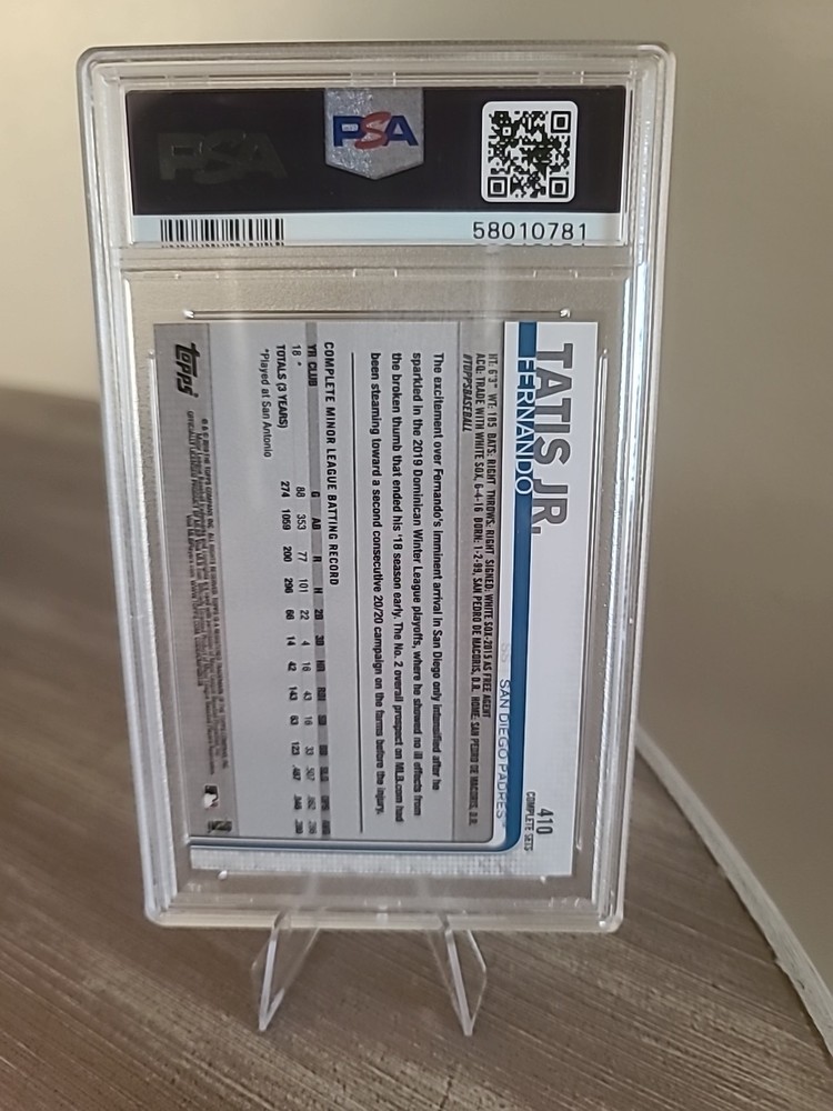 2019 Topps Complete Set includes Fernando Tatis Jr.'s Rookie Card #410, graded PSA 10 Gem Mint. This trading card features the San Diego Padres' notable shortstop in his rookie season.