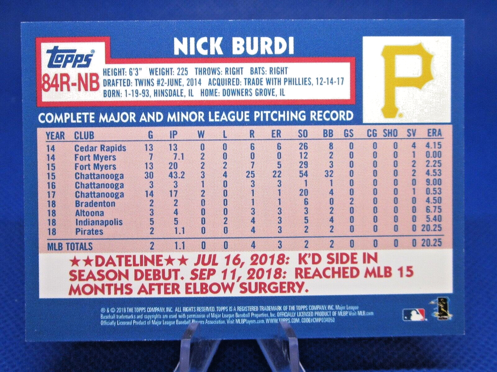 Here I have a 2019 Topps 1989 Retro Design Mini Pink Parallel rookie card of Nick Burdi. This card is number 84R-NB. It is serial numbered 02 of only 25. I have a lot of short print and parallel cards from different years and different series listed. Please check them out. I offer free shipping on all my items. Your card will be shipped in a semi rigid top loader inside a plain white envelope. With a tracking number provided. Any orders that total over $20 will be shipped in a bubble mailer with a tracking number. I have been with Ebay since 2002 and have maintained a 100 percent positive feedback throughout. So buy from a trusted seller. Please feel free to ask any questions.