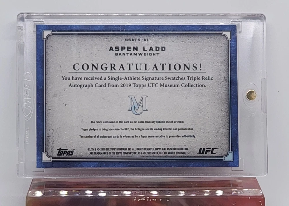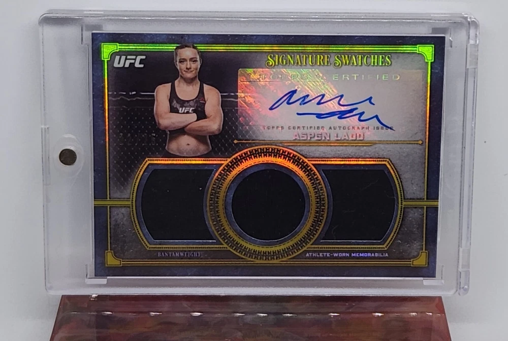 Elevate your collection with the 2019 Topps Museum Collection Gold Swatches card featuring UFC fighter Aspen Ladd. This highly sought-after piece from the "Single Athlete Signature Swatches" set is a treasure for enthusiasts and fans of mixed martial arts. With a limited print run of just 25, this card is not only a rare find but also a unique snapshot of Aspen Ladd's 2019 season. The card, numbered SSADR-AL, includes authentic memorabilia and a striking gold parallel variety that sets it apart. It comes with Aspen Ladd's autograph authenticated by Topps, ensuring its integrity and value. This collectible showcases Ladd's prowess and is a must-have for MMA aficionados and sports card collectors alike.