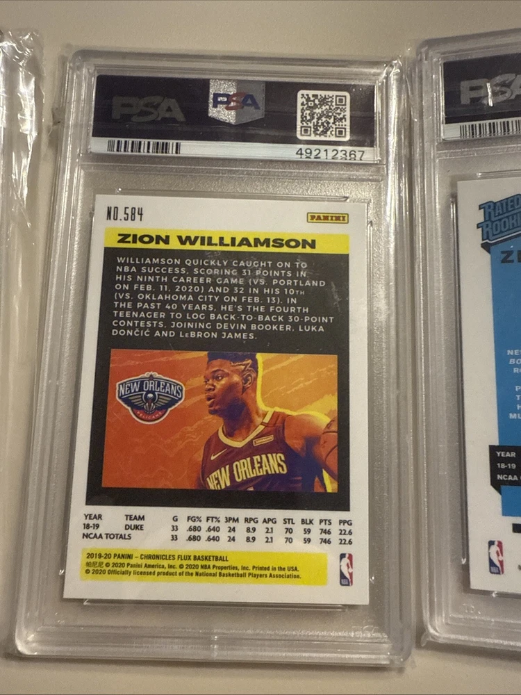 The product is a 2019 Panini Donruss Optic trading card featuring Zion Williamson, a rookie player from Duke Blue Devils and New Orleans Pelicans in the NBA. The card is numbered 158 and has been graded as a PSA 9, indicating it is in mint condition. This card is part of a lot of Zion Williamson cards from the 2019-20 season, offering collectors the chance to own a piece of memorabilia from this highly sought-after basketball player. 4 cards total 2019 Chronicles Rookie Card - psa 9 2019 Flux Rookie Card - psa 10 2019 Donruss Optic Rated Rookie - psa 9 2019 Hoops Rookie - psa 9