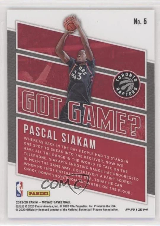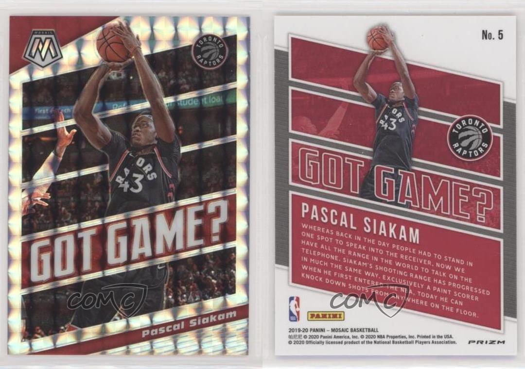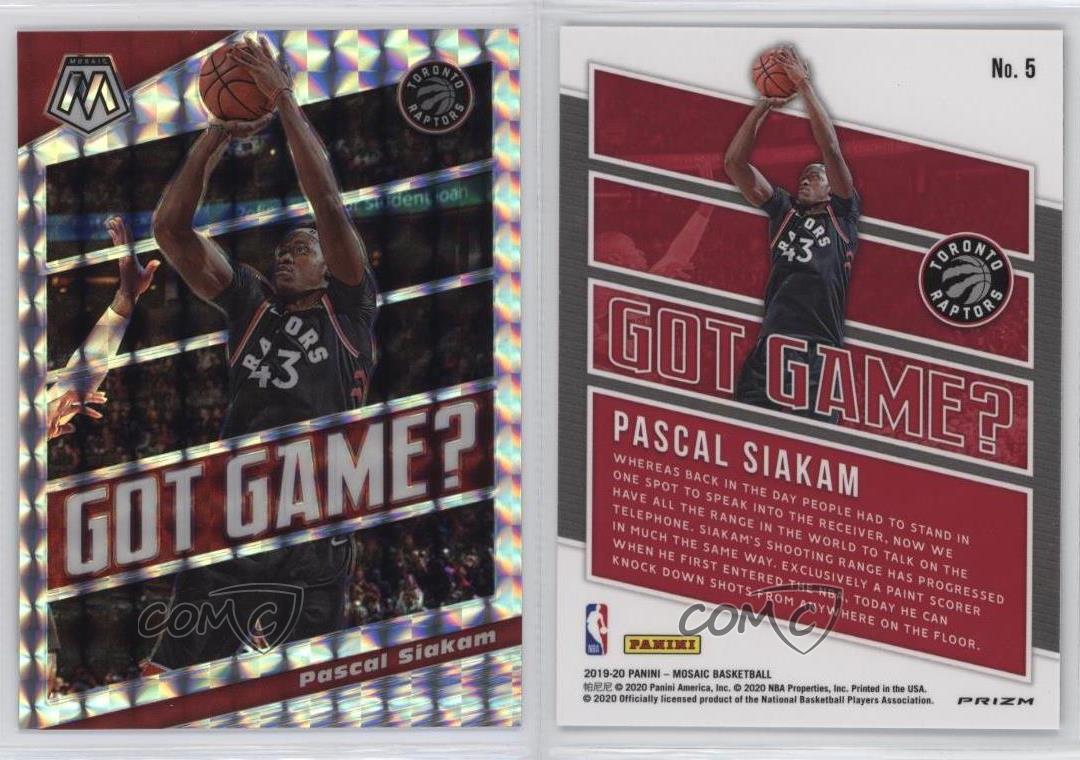 2019-20 Panini Mosaic - Got Game? - Silver Mosaic Prizm #5 Pascal Siakam - Basketball Card - Featuring the Toronto Raptors - Featuring Pascal Siakam Search for more: 2019-20 Panini Mosaic Search for more: 2019-20 Panini Mosaic - Got Game? - Silver Mosaic Prizm View all of our Listings Auctions Buy It Now About Us Located in the beautiful Pacific Northwest, COMC (Check Out My Cards) is the world's largest consignment service for trading card singles. More than 10,000 people have used our consignment service to list over 50 million trading cards. We currently house 20 million cards, each listed for sale with front and back images of the actual card. Find out how we can help you consign your items on eBay by contacting us through eBay messaging. COMC -- "The Safe & Easy Way to Buy & Sell" Representative Image - Select Specific Item above to see image of actual item Representative Image - Select Specific Item above to see image of actual item Raw Condition for Modern Cards Unless otherwise noted, raw modern cards are listed in Near Mint-Mint condition or better. A NM-MT card appears to be Mint at first glance, but upon closer inspection, may exhibit some of the following: minor print defects (e.g. roller marks, print line, dimple), minor scratches, slight edge wear, and slight corner wear. Centering is clearly visible in the images provided and does not factor into our condition assessment. Raw Condition for Vintage Cards Unless otherwise noted, raw vintage cards are listed in Excellent condition or better. An EX card may exhibit some of the following: minor rounding of corners, surface wear, print defects, light scratches, and slight edge wear/chipping. Centering is clearly visible in the images provided and does not factor into our condition assessment. Domestic Shipping Combined shipping for multiple items is available. To receive combined shipping, please ensure all desired items are in your eBay shopping cart before proceeding to checkout. eBay limits orders to 40 items per order. We automatically combine multiple orders placed on the same day. If you place multiple orders on the same day, please contact us to request a refund of applicable shipping costs. Signature confirmation may be required on invoices over $400. Raw cards are shipped in toploaders. International Shipping COMC offers eBay's International Shipping (EIS) for international orders under $2,500* (see country exceptions below). All duties and import fees are paid at checkout; in the rare event that there are additional import fees upon delivery, these are borne by the buyer. EIS packages route through a shipping hub in Erlanger, KY before shipping to their final destination. Please note that EIS does not allow for combined shipments. The shipping rates are determined by eBay and cannot be adjusted. *Maximum sale price exceptions: Colombia, Kuwait ($2,000); Taiwan ($1,539); Chile, Costa Rica, Guatemala, Honduras, Trinidad and Tobago ($1,000); Antigua and Barbuda, Aruba, Belize, Dominica, Grenada, Philippines, Saint Kitts and Nevis, Saint Lucia, Montserrat, Turks and Caicos Islands ($500); Dominican Republic, El Salvador ($200). Please request a shipping quote through eBay messaging for orders that exceed the maximum sale price supported by eBay's International Shipping. You will be responsible for all duties and import fees for international orders shipped outside the EIS. Raw cards are shipped in toploaders. Payment COMC does not accept offers on our cards through our eBay storefront. COMC utilizes eBay’s managed payments system. If you are experiencing difficulties making a payment, please contact eBay for assistance. Return Policy Returns are only accepted on the rare occasion the item is not as described. If you are making a return, please initiate the return process through eBay so a mailing label can be provided for you. Prior to listing, our expert team carefully assessed this item to represent it accurately. Please review the description and high-definition images prior to purchasing to ensure this item meets your satisfaction. We welcome you to contact us if you have further questions about this item. Trust and Integrity COMC carefully assesses each item consigned to us to prevent fraudulent items from entering the marketplace. If you believe an item offered on COMC may be fraudulent, please contact us with details so we can investigate the issue. Items we determine are outside our supported items policy may be removed. Last Modified: 12/31/2024 8:46:03 PM PDT