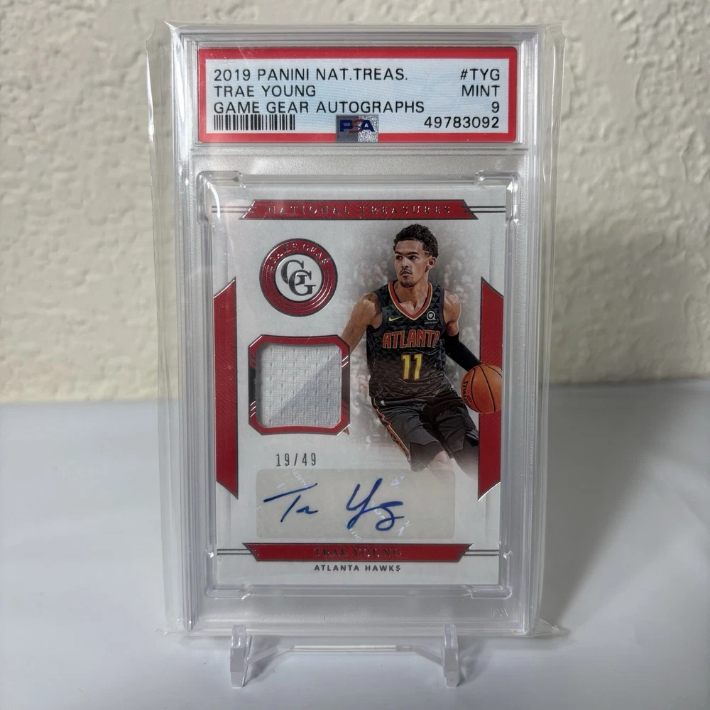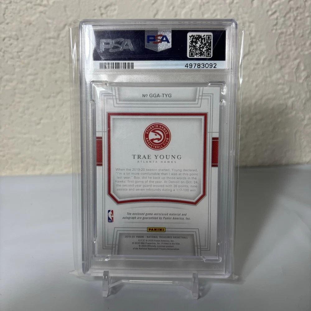 The 2019-20 Panini National Treasures Trae Young Game Gear Patch Auto /49 PSA 9 MINT trading card features an autograph from basketball player Trae Young, known for his time with the Atlanta Hawks and Oklahoma Sooners. This sports trading card is part of the National Basketball Association (NBA) league and is manufactured by Panini. It includes a memorabilia patch and is serial numbered to only 49 copies, making it a rare and valuable collectible for fans of Trae Young and basketball trading cards.