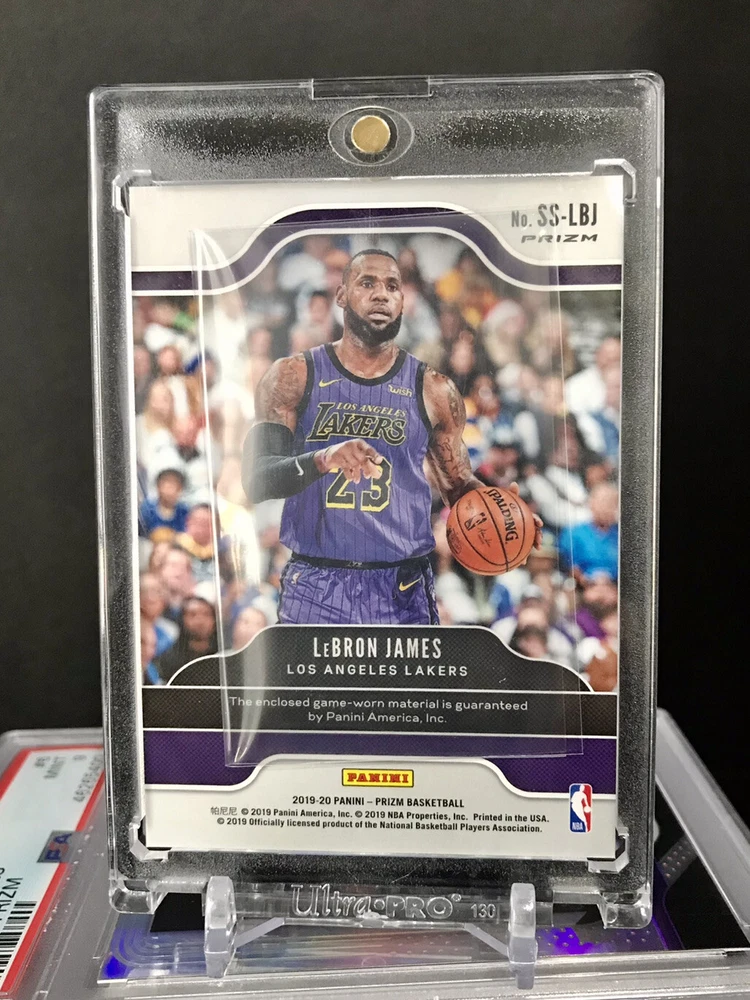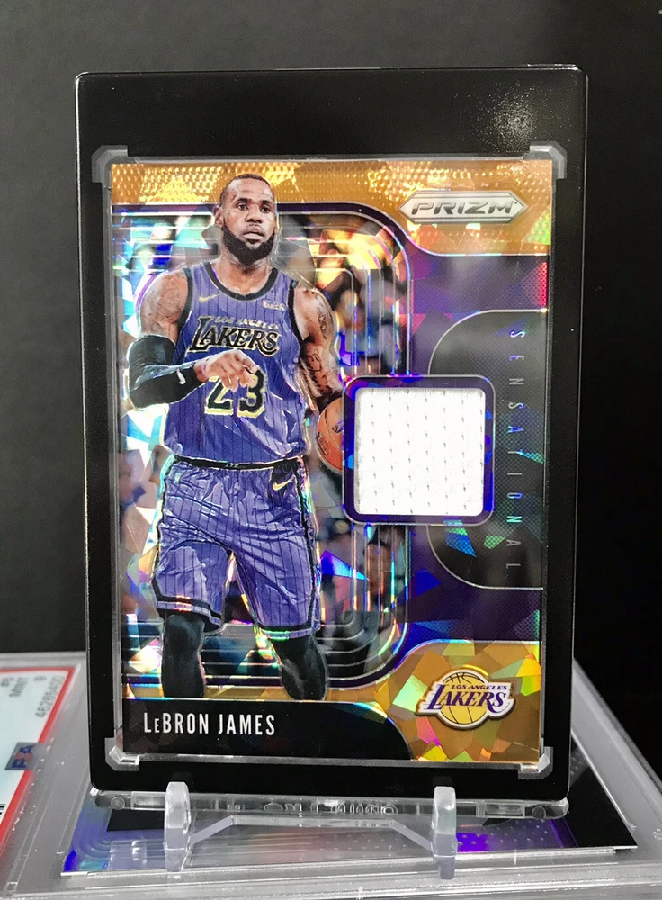 This 2019-20 Panini Prizm trading card features a game-worn orange ice jersey of LeBron James, a renowned athlete. The card is a near mint or better quality, and it is a patch variation, making it a unique item for collectors. It is a perfect addition to any sports trading card collection and a must-have for fans of LeBron James. The card is ungraded, and it comes from the 2019-20 season.