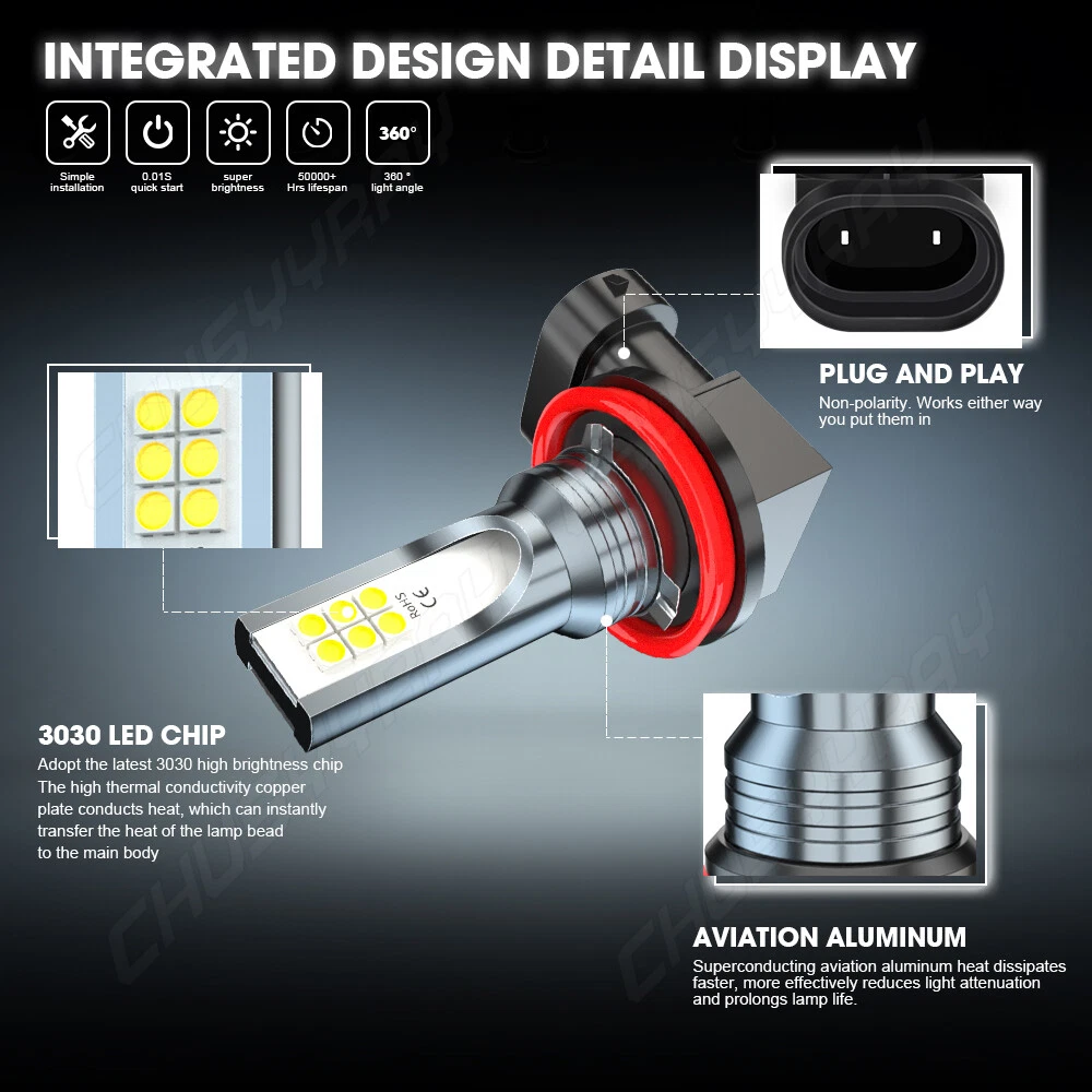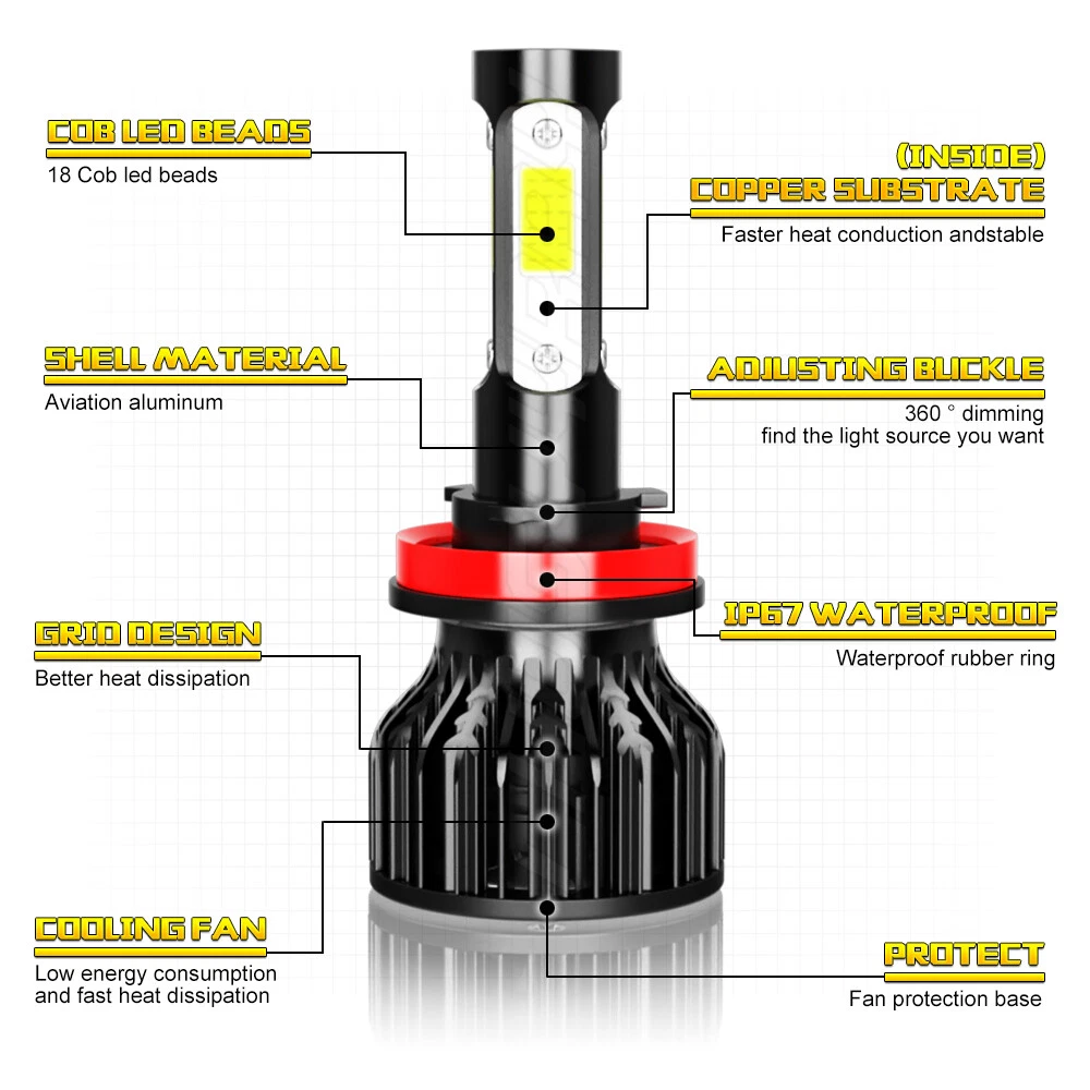 Specifications 1. Condition: 100% Brand New / Never Used / H11/H11/& H11/H8/H9 . 4-Sided LED Bulb ,Each Bulb Total have 2pcs Long COB LED Chips 3. Voltage: DC 9-32V ( Fit 12V,24V Vehicle ) 4. IP Rate: IP68 5. LED type: COB LEDs 6. Beam Angle: 360° 7. Color Temperature: 6000K-6500K White 8. Heat Dissipation Theory: Heat Pipe Technology + A380 Aluminum Heatsink 9. Operating Life: >50,000hrs 10. Operating Temperature: -40 - +80°C 11. Application: High & Low Head Lights 12. Number of Bulbs: 6 13. To Fit: High & Low Head Lights KIt 14. Placement on Vehicle: Left,Right,Front Package Content: 2x H9 High Power LED HeadLights Bulbs 2x H11 High Power LED HeadLights Bulbs 2x H11/H9 High Power LED Fog Light Bulbs Well Packaged in Retail Box 5 Years Warranty Automotive LED headlamps advantages: 1. LED lights than traditional halogen energy, more power. 2. Xenon lamp brightness and proximity , but the LED lights light up without delay, to enhance road safety. Instant start no strong currents impact , effectively protecting the car comes with a battery , improving battery life of more than 30%. 3. Fast cooling , the appearance of the most advanced design , thermal structure ingenious and reasonable.Less warranty, power driver with wide voltage constant current mode , the car can respond to a variety of voltage instability , the effective protection of normal use Led efficient and simple structure . Fewer Components damaged, repair the probability is very low , compared with HID ballast repair lower than 80% . 4. Heating temperature is low , protect the car . Xenon working temperature up to 800 ° -1000 ° , the main reason for the car ignition . 5. LED car headlights simple structure, fewer parts than xenon lamps, significantly lower than the xenon lamp failure rates ! 6. Automotive LED headlamps color temperature balancing. The Xenon bulbs in the same color to clear , about 6000K. Install Caution 1. As a safety precaution, make sure that the car has had time to cool down properly before starting the installation process. 2. Put the vehicle into park or make sure it is securely in gear. 3. Make sure to have the ignition turned off and the keys removed. 4. Be careful to avoid burns, especially when turning on or off the vehicles lighting. 5. Be careful to avoid crushing or cutting the bulbs. Also make sure to not touch the bulbs with your fingers, as this will cause blotting. 6. Fully examine the connection of the contact points, ports and the wires as faulty connections can cause lighting problems. 7. Make certain that the end of the bulb does not come in contact with the interior light shield of the headlight when adjusting the bulb. Information: a)Compatible List can not show up all Car model. Please check the Correct item size of your vechicle. it will work and fit.Thank you! b)If you are unsure the item fit or not , please do remember send message to tell us your car make, model, year and other information which is helpful to check the item fit or not.For example: For 2004 Ford F 150, high/low beam For 2015 RAM 1500 with projector-type, high beam For 2019 Ford F 150 ,XL Crew Cab Pickup 4-Door 2.7L On Nov 18, 2024 at 05:20:47 PST, seller added the following information: