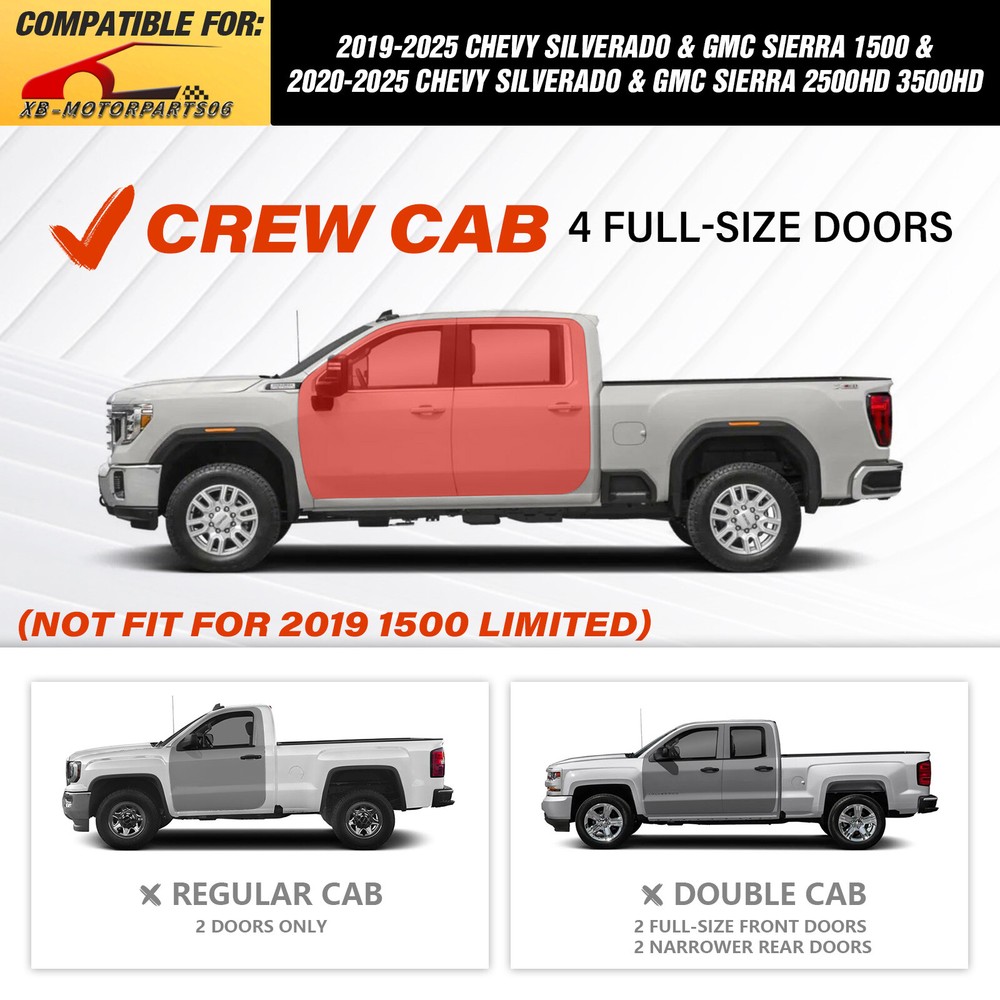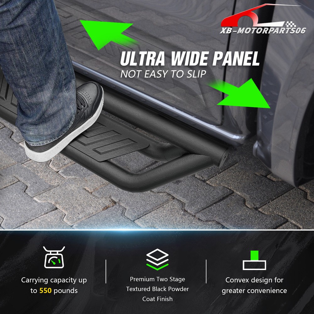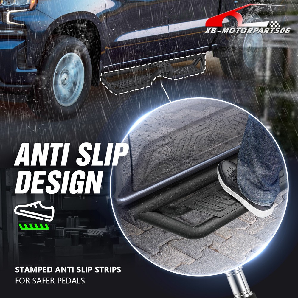 Side Steps Running Boards For 2019-2025 Chevy Silverado&GMC Sierra 1500 Crew Cab Suitable Models : Compatible with 2019-2025 Chevy Silverado & GMC Sierra 1500, 2020-2025 Chevrolet Silverado & Sierra 2500 3500 HD Crew Cab ( Not For 2019 1500 Limited ) ( 4 Full-Size Doors ) Package Includes : 2 side bars, a set of brackets, installation instructions, and all necessary hardware Product Information : Product Dimensions: 83 x 6 x 6 inches Installation mode: Bolt-On Weight Limit: 550LBS Placement on Vehicle: Left and Right Item Weight: 70.4 pounds Material: Carbon Steel Color: Black (hand measurements may have an error of 2-3 mm/0.078-0.118 in) Feature: ① The side steps feature a dual-layer design, enhancing convenience for vehicles with lift kits and oversized tires, while also making roof access easier; ② The extra-thick main tube provides superior load-bearing capacity, preventing deformation and enhancing vehicle protection; ③ The stepping area is designed with a high-end textured pattern, ensuring secure and stable footing to prevent slipping; ④ The high-quality black powder coating provides outstanding rust and corrosion resistance. Constructed from heavy-duty 2mm carbon steel, each side can withstand a weight of 550 pounds; ⑤ Simple bolt-on installation without the need for drilling or cutting; Warranty Period : 2 year Standard Shipping (FedEx Ground or FedEx Home Delivery) Will usually ship within 3 business days of receiving cleared payment Suitable Models : Compatible with 2019-2025 Chevy Silverado & GMC Sierra 1500, 2020-2025 Chevrolet Silverado & Sierra 2500 3500 HD Crew Cab ( Not For 2019 1500 Limited ) ( 4 Full-Size Doors ) Package Includes : 2 side bars, a set of brackets, installation instructions, and all necessary hardware Product Information : Product Dimensions: 83 x 6 x 6 inches Installation mode: Bolt-On Weight Limit: 550LBS Placement on Vehicle: Left and Right Item Weight: 70.4 pounds Material: Carbon Steel Color: Black (hand measurements may have an error of 2-3 mm/0.078-0.118 in) Feature: ① The side steps feature a dual-layer design, enhancing convenience for vehicles with lift kits and oversized tires, while also making roof access easier; ② The extra-thick main tube provides superior load-bearing capacity, preventing deformation and enhancing vehicle protection; ③ The stepping area is designed with a high-end textured pattern, ensuring secure and stable footing to prevent slipping; ④ The high-quality black powder coating provides outstanding rust and corrosion resistance. Constructed from heavy-duty 2mm carbon steel, each side can withstand a weight of 550 pounds; ⑤ Simple bolt-on installation without the need for drilling or cutting; Warranty Period : 2 year