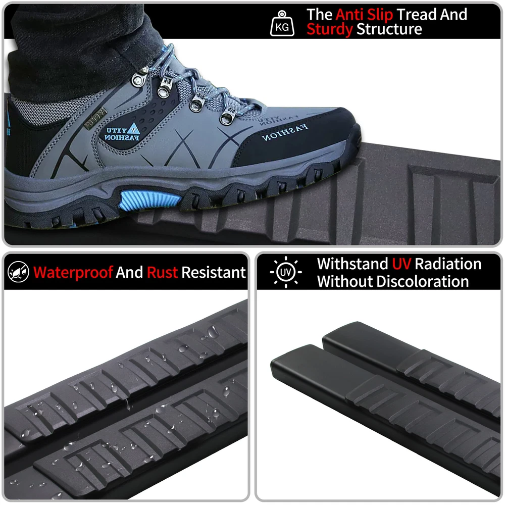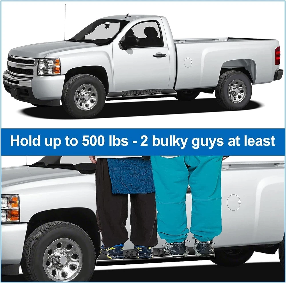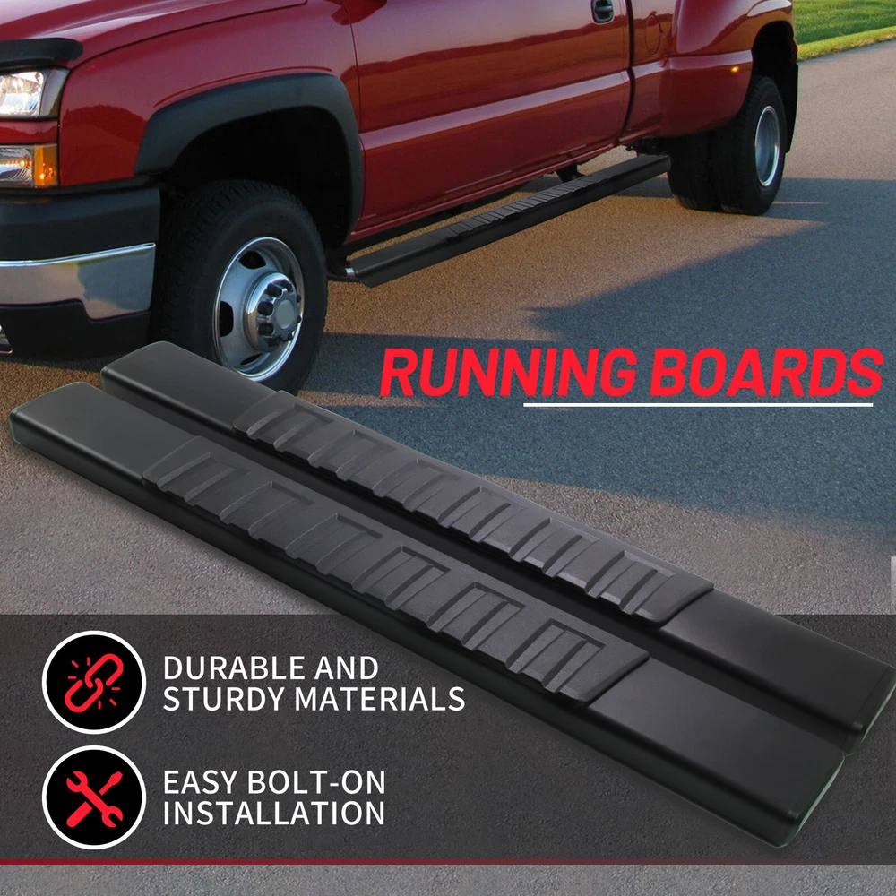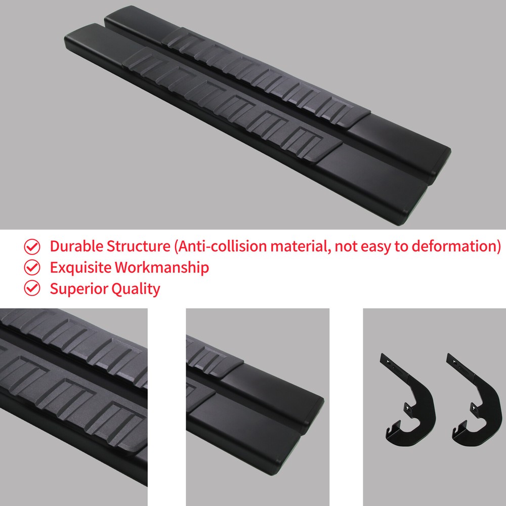 Fitment: 2019 - 2025 Chevrolet Silverado 1500 2020 - 2025 Chevrolet Silverado 2500HD/3500HD 2019 - 2025 GMC Sierra 1500 2020 - 2025 GMC Sierra 2500HD/3500HD Package Include: 1x Pair of Running Boards (Left + Right) Brackets on Each Side Mounting Hardware Features & Benefits : 1.High-Quality Material: These running boards are made from a blend of durable, heavy-duty stainless steel and ABS plastic. The seamless ABS plastic tread is joined with a powder-coated body surface to resist UV rays, rust, and slippage. They are also composed of the finest aluminum alloy, ensuring sturdiness, durability, and resistance to wear and rust. 2.Protective and Convenient: These running boards protect the car's paint from scratches and allow easy access to the top of the car for tasks such as reaching the luggage rack or cleaning the rooftop. The slider design allows forward and backward adjustment for better customization and a clean interior due to the closed-end design. 3.Stylish Finish: Regardless of the finish you choose, these running boards provide a smooth, finished look that perfectly complements your factory chrome and trim. 4.Safety and Comfort: The running boards and side steps provide a safe and simple way to transport coworkers, pets, or children. The anti-slip tread surface and rugged construction ensure a solid underfoot feeling. 5.Easy Installation: These running boards offer an easy bolt-on installation with no cutting or drilling required. Made of high-quality ABS plastic and steel, they can support up to 500 lbs. Both driver and passenger side steps are included, with all brackets and mounting hardware provided. The installation guide combines graphics and text for a detailed walkthrough.