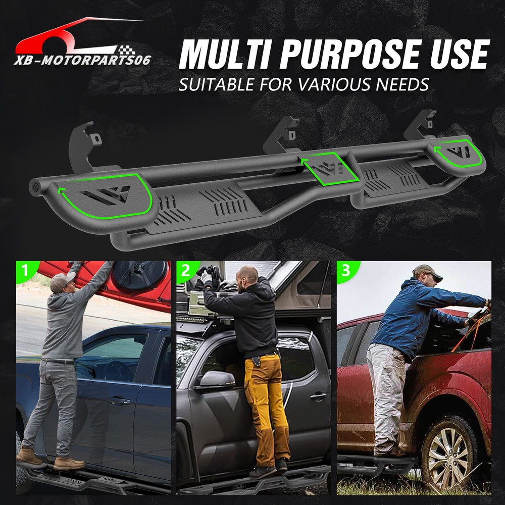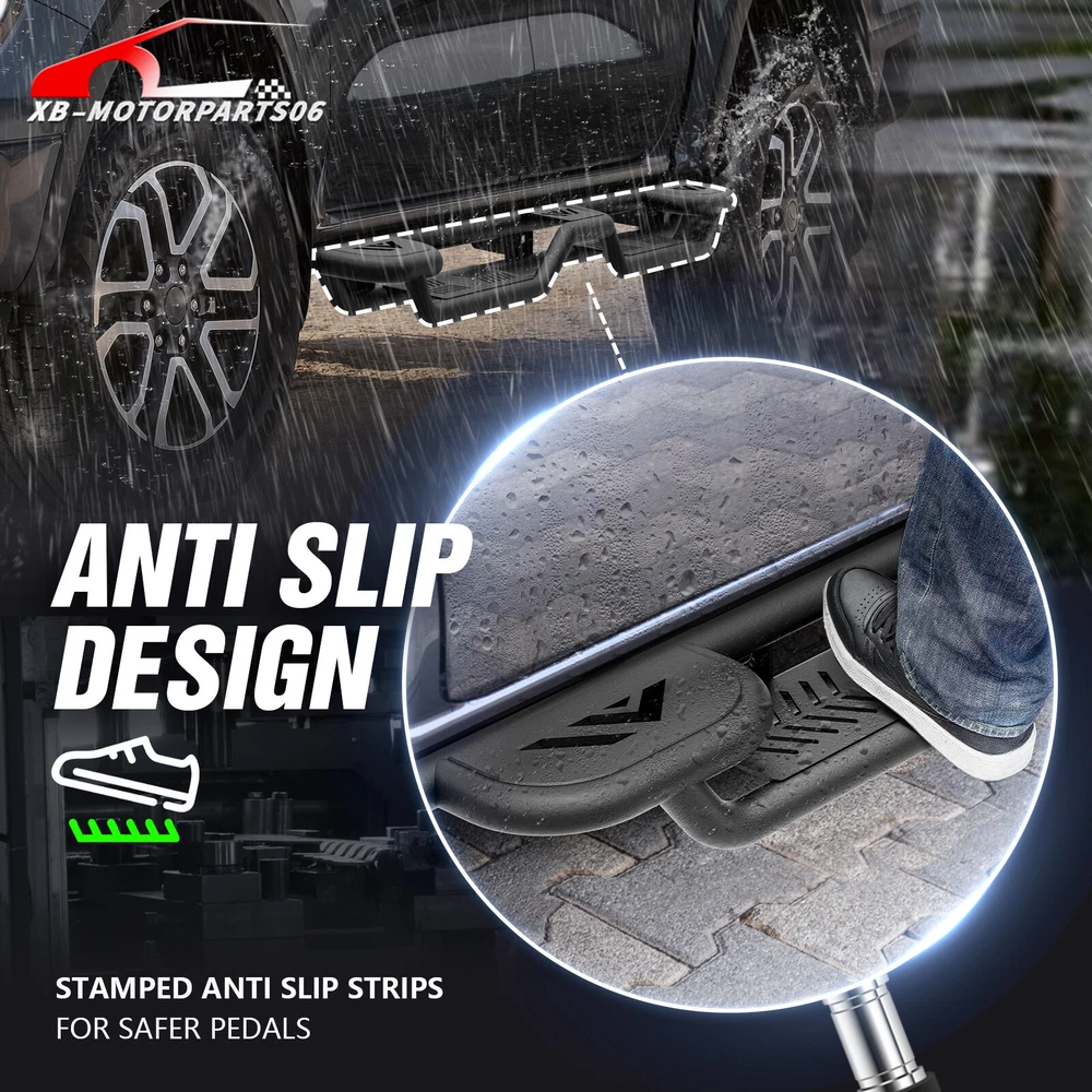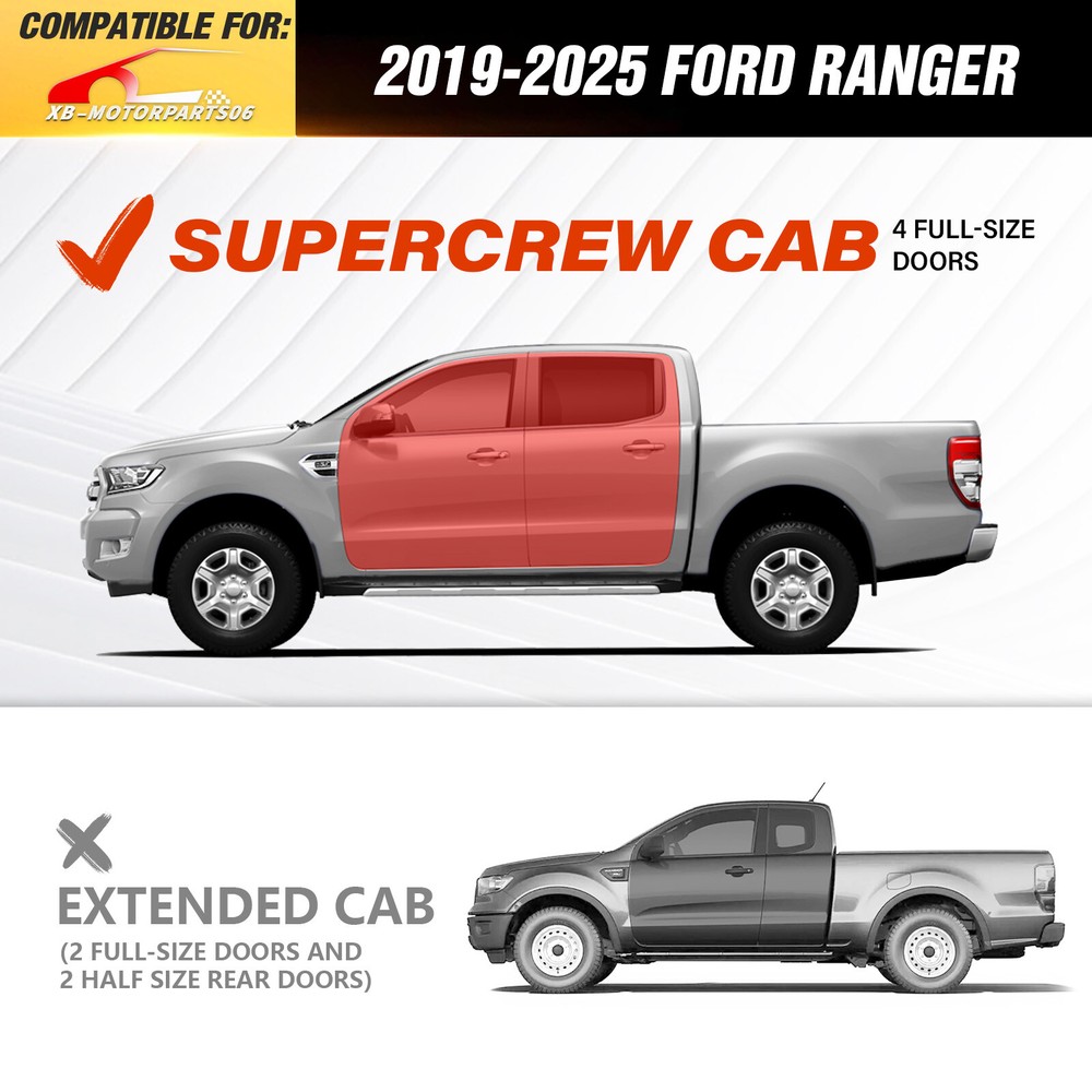 Side Running Boards For 2019-2025 Ford Ranger Supercrew Cab Three Raised Steps Suitable Models : Compatible with 2019-2025 Ford Ranger Supercrew Cab (4 Full Size Doors) Package Includes : 2 x Running Boards Side Steps, brackets, instructions, and all necessary hardware Product Information : Product Dimensions: 80 x 7 x 5 inches Installation mode: Bolt-On Weight Limit: 550LBS Placement on Vehicle: Left and Right Item Weight: 69.08 pounds Material: Carbon Steel Color: Black (hand measurements may have an error of 2-3 mm/0.078-0.118 in) Feature: ① Three Raised Steps for easy access to the roof, allowing multiple users to work on the vehicle simultaneously; ② Dual-layer Layout provides enhanced convenience for vehicles equipped with lift kits and oversized tires, offering easier access to the roof while maintaining sufficient ground clearance; ③ The high-quality black powder coating provides outstanding rust and corrosion resistance. Constructed from heavy-duty 2mm carbon steel, each side can withstand a weight of 550 pounds. Precision laser cutting and stamping techniques contribute to a non-slip step surface and enhanced traction; Warranty Period : 2 year Standard Shipping (FedEx Ground or FedEx Home Delivery) Will usually ship within 3 business days of receiving cleared payment Suitable Models : Compatible with 2019-2025 Ford Ranger Supercrew Cab (4 Full Size Doors) Package Includes : 2 x Running Boards Side Steps, brackets, instructions, and all necessary hardware Product Information : Product Dimensions: 80 x 7 x 5 inches Installation mode: Bolt-On Weight Limit: 550LBS Placement on Vehicle: Left and Right Item Weight: 69.08 pounds Material: Carbon Steel Color: Black (hand measurements may have an error of 2-3 mm/0.078-0.118 in) Feature: ① Three Raised Steps for easy access to the roof, allowing multiple users to work on the vehicle simultaneously; ② Dual-layer Layout provides enhanced convenience for vehicles equipped with lift kits and oversized tires, offering easier access to the roof while maintaining sufficient ground clearance; ③ The high-quality black powder coating provides outstanding rust and corrosion resistance. Constructed from heavy-duty 2mm carbon steel, each side can withstand a weight of 550 pounds. Precision laser cutting and stamping techniques contribute to a non-slip step surface and enhanced traction; Warranty Period : 2 year