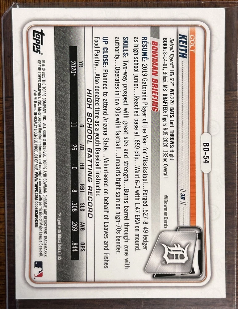 2020 Bowman Draft #BD-54 Colt Keith 1st Chrome Gold #/50 Refractor Rookie RC πŸ“ˆ