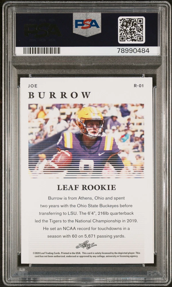 You are purchasing a 2020 Leaf Special Release Rookie Joe Burrow #R-01 Special Release Rookie PSA 9. You will receive the exact item in the photographs. Thank you for looking. Listed With Mascot .