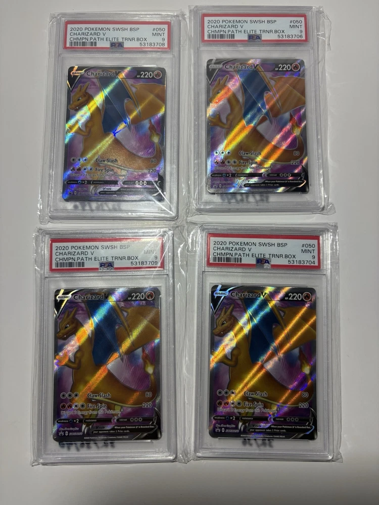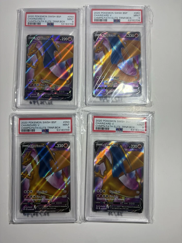 This lot includes four PSA-graded 9 Mint Pokémon TCG cards, all featuring the powerful Charizard V These cards are perfect for any serious collector or player, and are sure to make a great addition to any collection.