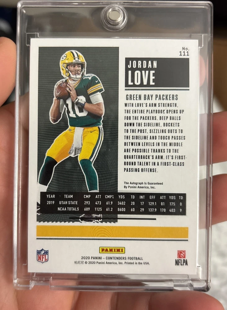 Sport:FootballPlayer/Athlete:Jordan LoveCard Number:111Set:2020 Panini ContendersManufacturer:PaniniSeason:2020Team:Green Bay PackersType:Sports Trading CardAutographed:YesParallel/Variety:Wild Card Rookie TicketVintage:NoOriginal/Licensed Reprint:OriginalFeatures:Base Set, Parallel/Variety, Rookie, Serial Numbered, Short PrintLeague:National Football League (NFL)