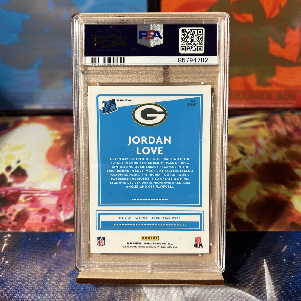This 2020 Panini Donruss Optic Jordan Love Rated Rookie Holo PSA 10 Gem Mint card is a must-have for any football fan or sports trading card collector. Featuring the Green Bay Packers quarterback, this card is a part of the base set and has a card number of 154. The card is manufactured by Panini and is a part of the National Football League (NFL) league. This sports trading card is a parallel/variety with a holo prizm and is rated as a PSA 10 Gem Mint. This card is an excellent addition to any collection and is a great way to show off your love for football.