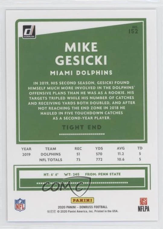 2020 Panini Donruss - [Base] - Press Proof Gold #152 Mike Gesicki Qty Made: 50 - Football Card - Featuring the Miami Dolphins - Featuring Mike Gesicki Search for more: 2020 Panini Donruss Search for more: 2020 Panini Donruss - [Base] - Press Proof Gold View all of our Listings Auctions Buy It Now About Us Located in the beautiful Pacific Northwest, COMC (Check Out My Cards) is the world's largest consignment service for trading card singles. More than 10,000 people have used our consignment service to list over 50 million trading cards. We currently house 20 million cards, each listed for sale with front and back images of the actual card. Find out how we can help you consign your items on eBay by contacting us through eBay messaging. COMC -- "The Safe & Easy Way to Buy & Sell" Representative Image - Select Specific Item above to see image of actual item Representative Image - Select Specific Item above to see image of actual item Raw Condition for Modern Cards Unless otherwise noted, raw modern cards are listed in Near Mint-Mint condition or better. A NM-MT card appears to be Mint at first glance, but upon closer inspection, may exhibit some of the following: minor print defects (e.g. roller marks, print line, dimple), minor scratches, slight edge wear, and slight corner wear. Centering is clearly visible in the images provided and does not factor into our condition assessment. Raw Condition for Vintage Cards Unless otherwise noted, raw vintage cards are listed in Excellent condition or better. An EX card may exhibit some of the following: minor rounding of corners, surface wear, print defects, light scratches, and slight edge wear/chipping. Centering is clearly visible in the images provided and does not factor into our condition assessment. Domestic Shipping Combined shipping for multiple items is available. To receive combined shipping, please ensure all desired items are in your eBay shopping cart before proceeding to checkout. eBay limits orders to 40 items per order. We automatically combine multiple orders placed on the same day. If you place multiple orders on the same day, please contact us to request a refund of applicable shipping costs. Signature confirmation may be required on invoices over $400. Raw cards are shipped in toploaders. International Shipping COMC offers eBay's International Shipping (EIS) for international orders under $2,500* (see country exceptions below). All duties and import fees are paid at checkout; in the rare event that there are additional import fees upon delivery, these are borne by the buyer. EIS packages route through a shipping hub in Erlanger, KY before shipping to their final destination. Please note that EIS does not allow for combined shipments. The shipping rates are determined by eBay and cannot be adjusted. *Maximum sale price exceptions: Colombia, Kuwait ($2,000); Taiwan ($1,539); Chile, Costa Rica, Guatemala, Honduras, Trinidad and Tobago ($1,000); Antigua and Barbuda, Aruba, Belize, Dominica, Grenada, Philippines, Saint Kitts and Nevis, Saint Lucia, Montserrat, Turks and Caicos Islands ($500); Dominican Republic, El Salvador ($200). Please request a shipping quote through eBay messaging for orders that exceed the maximum sale price supported by eBay's International Shipping. You will be responsible for all duties and import fees for international orders shipped outside the EIS. Raw cards are shipped in toploaders. Payment COMC does not accept offers on our cards through our eBay storefront. COMC utilizes eBay’s managed payments system. If you are experiencing difficulties making a payment, please contact eBay for assistance. Return Policy Returns are only accepted on the rare occasion the item is not as described. If you are making a return, please initiate the return process through eBay so a mailing label can be provided for you. Prior to listing, our expert team carefully assessed this item to represent it accurately. Please review the description and high-definition images prior to purchasing to ensure this item meets your satisfaction. We welcome you to contact us if you have further questions about this item. Trust and Integrity COMC carefully assesses each item consigned to us to prevent fraudulent items from entering the marketplace. If you believe an item offered on COMC may be fraudulent, please contact us with details so we can investigate the issue. Items we determine are outside our supported items policy may be removed. Last Modified: 10/19/2024 4:45:17 AM PDT