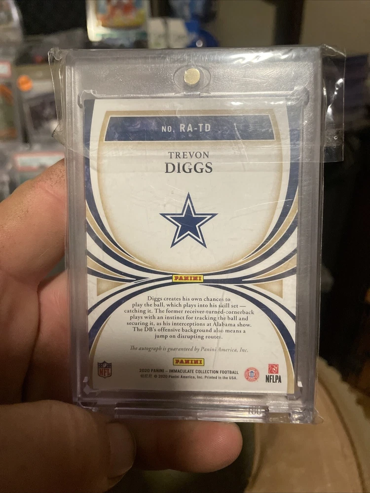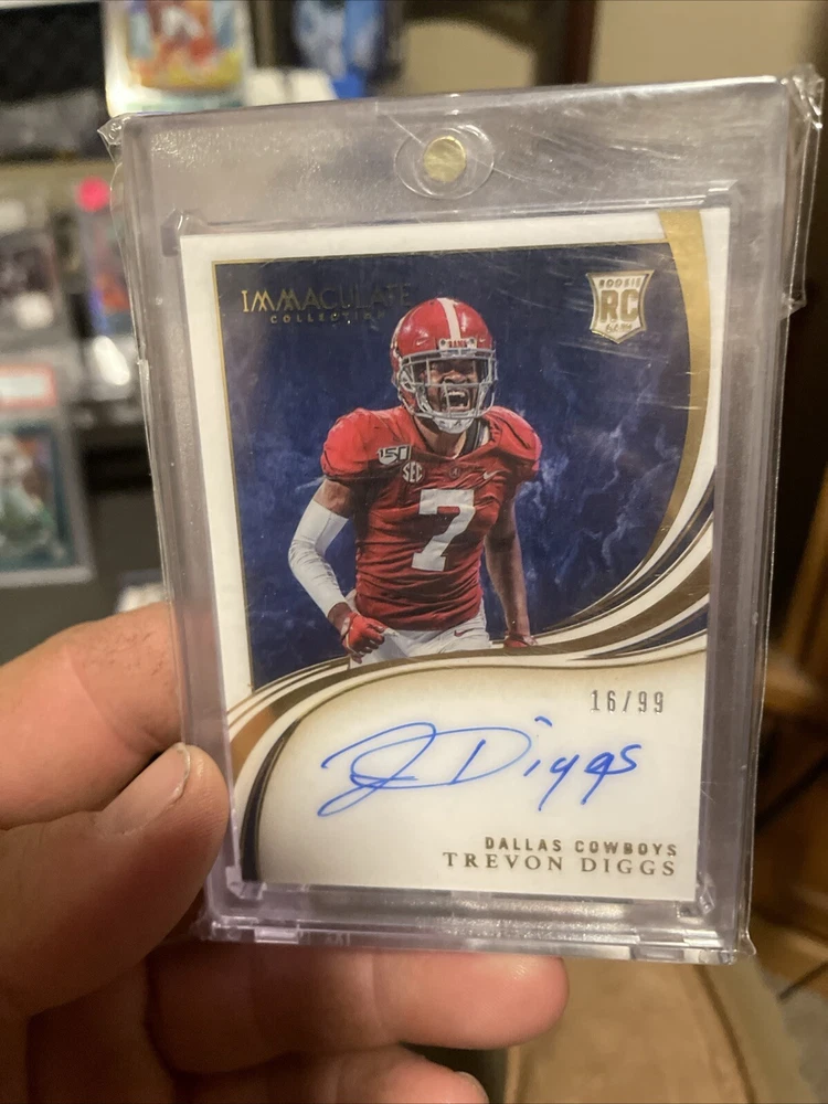 This 2020 Panini Immaculate Collection trading card features Trevon Diggs, a highly sought-after rookie athlete. The card is a part of the Rookie Autographs insert set and is numbered RA-TD. It is a limited edition item with a print run of only 99, making it a valuable addition to any sports trading card collection. The card showcases Diggs in his Alabama Crimson Tide and Dallas Cowboys gear and is perfect for fans of the National Collegiate Athletic Association (NCAA) and National Football League (NFL). It is manufactured by Panini and is an excellent opportunity to get your hands on a piece of sports history.
