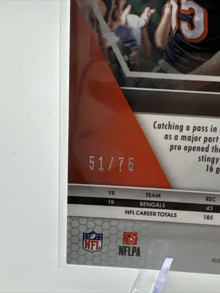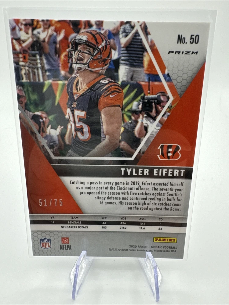 Elevate your collection with the 2020 Panini Mosaic No Huddle Blue Prizm #50 featuring the talented Tyler Eifert of the Cincinnati Bengals. This limited edition card is serial numbered, adding a unique touch to its collectibility. With its eye-catching blue prizm finish and the prestige of being a part of the esteemed 2020 Panini Mosaic set, this card is a standout piece for any football enthusiast or card collector. Crafted with quality in mind by Panini, the renowned manufacturer, this card boasts a range of features like inserts, chase cards, and holograms, ensuring its exclusivity and desirability. Whether you're a fan of the NFL, collecting cards of promising athletes, or seeking to add value to your sports memorabilia, this card checks all the boxes for a remarkable addition to your collection.
