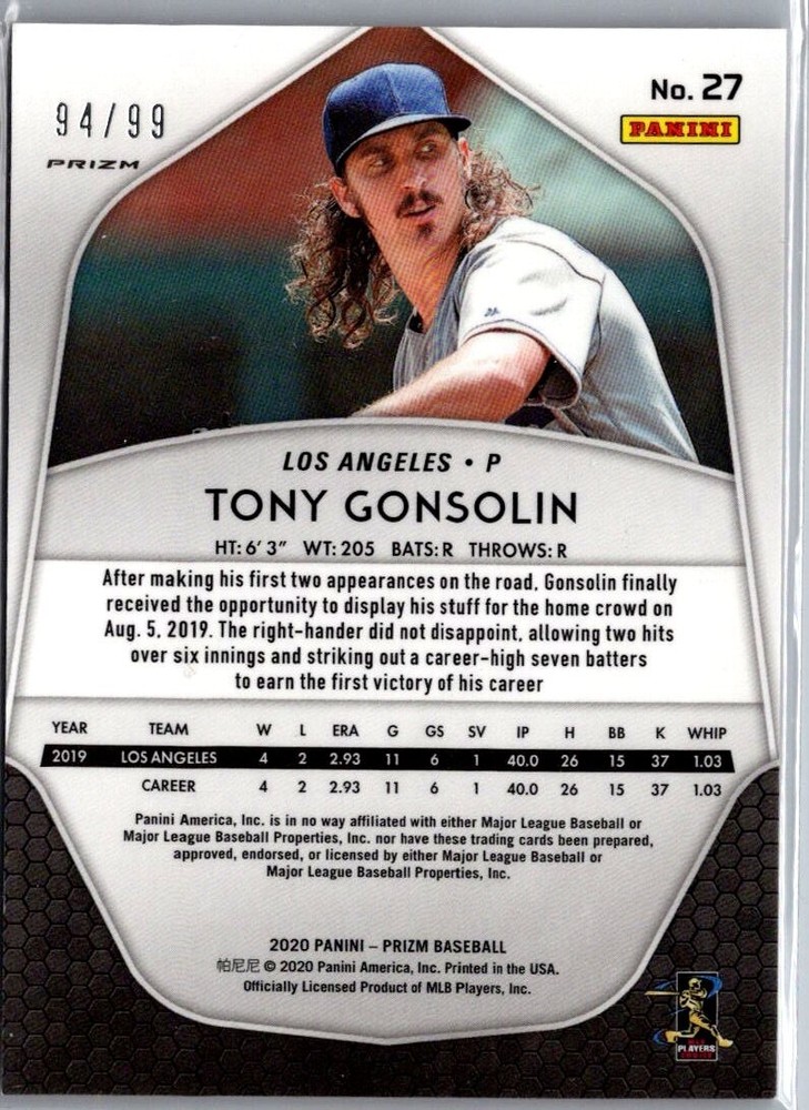 Card Manufacturer: Panini America, Inc. Card Attributes: Rookie, SerialNumbered Type: Sports Trading Card Team: Los Angeles Dodgers Parallel/Variety: Quick Pitch Red Donut Circle Prizm Year: 2020 Sport: Baseball Player: Tony Gonsolin Year Manufactured: 2020 Set: 2020 Panini Prizm - [Base] - Quick Pitch Red Donut Circle Prizm Franchise: N/A Athlete: Tony Gonsolin Product: Single-Parallel Original/Reprint: Original Card Number: 27 Manufacturer: Panini America, Inc. Player/Athlete: Tony Gonsolin Season: 2020 Card Name: Tony Gonsolin