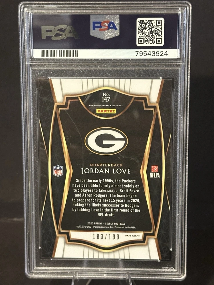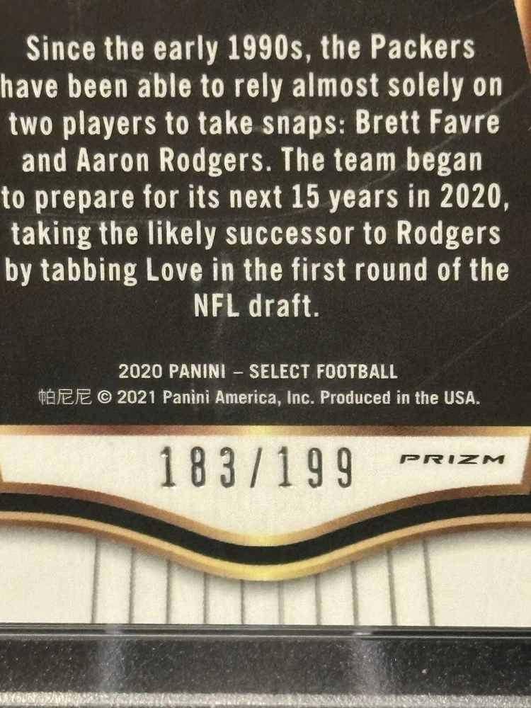 Team:Green Bay PackersParallel/Variety:PrismManufacturer:SelectSport:FootballPlayer/Athlete:Jordan LoveFeatures:Rookie, Serial NumberedType:Sports Trading CardSet:2020 SelectPrint Run:199League:National Football League (NFL)Card Number:199Season:2020