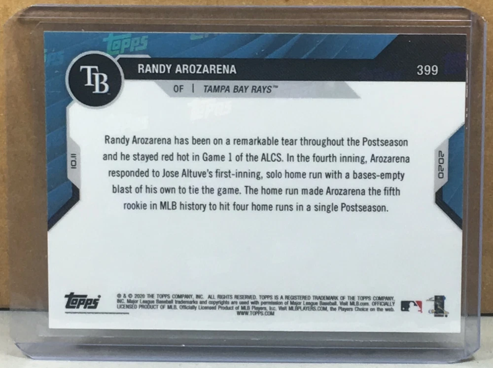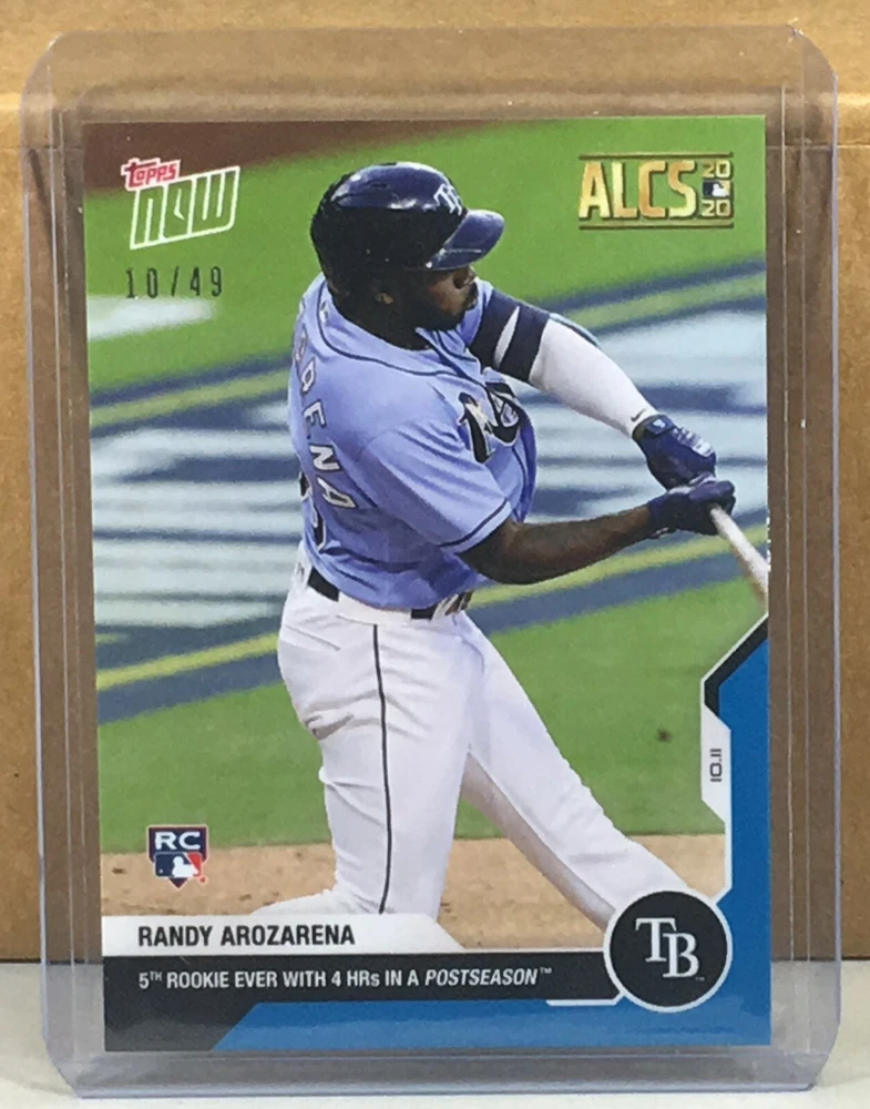 2020 TOPPS NOW #399 RANDY AROZARENA TAMPA BAY RAYS ROOKIE ALCS 5th rookie ever with 4 HRs in a postseason. Blue parallel serial #'d 10/49. Worldwide shipping available. U.S. - Winning bidder to add $3.50.50 for careful USPS first class shipping with delivery confirmation. Add .50 for each additional item. Canada - Winning bidder to add $11.99 for careful USPS air mail shipping. Add $1 for each additional item. All other countries - Winning bidder to add $14.99 for careful USPS air mail shipping. Add $1 for each additional item. Bid with confidence, 49000+ feedback. Thanks and check out my auctions ending every Sunday. Over 800 items ending every Sunday featuring eTopps singles, Topps Living singles, Topps Living week sets, Topps Living PSA, Topps Now singles, Topps Now PSA and Topps Project 2020 singles. Please note that combined ship rates are for items paid for on one invoice, thanks!
