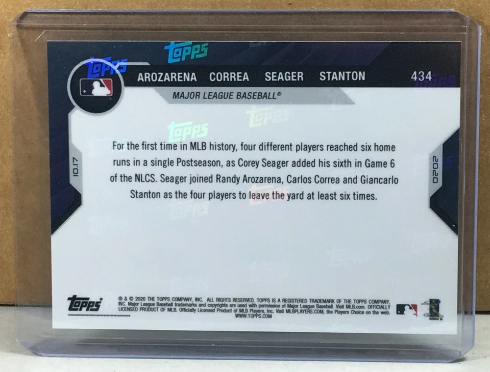 2020 TOPPS NOW #434 RANDY AROZARENA TAMPA BAY RAYS ROOKIE / CARLOS CORREA / COREY SEAGER / GIANCARLO STANTON MLB record 4 different players tally 6+ postseason HRs. Purple parallel serial #'d 13/25. Worldwide shipping available. U.S. - Winning bidder to add $3.50.50 for careful USPS first class shipping with delivery confirmation. Add .50 for each additional item. Canada - Winning bidder to add $11.99 for careful USPS air mail shipping. Add $1 for each additional item. All other countries - Winning bidder to add $14.99 for careful USPS air mail shipping. Add $1 for each additional item. Bid with confidence, 49000+ feedback. Thanks and check out my auctions ending every Sunday. Over 800 items ending every Sunday featuring eTopps singles, Topps Living singles, Topps Living week sets, Topps Living PSA, Topps Now singles, Topps Now PSA and Topps Project 2020 singles. Please note that combined ship rates are for items paid for on one invoice, thanks!