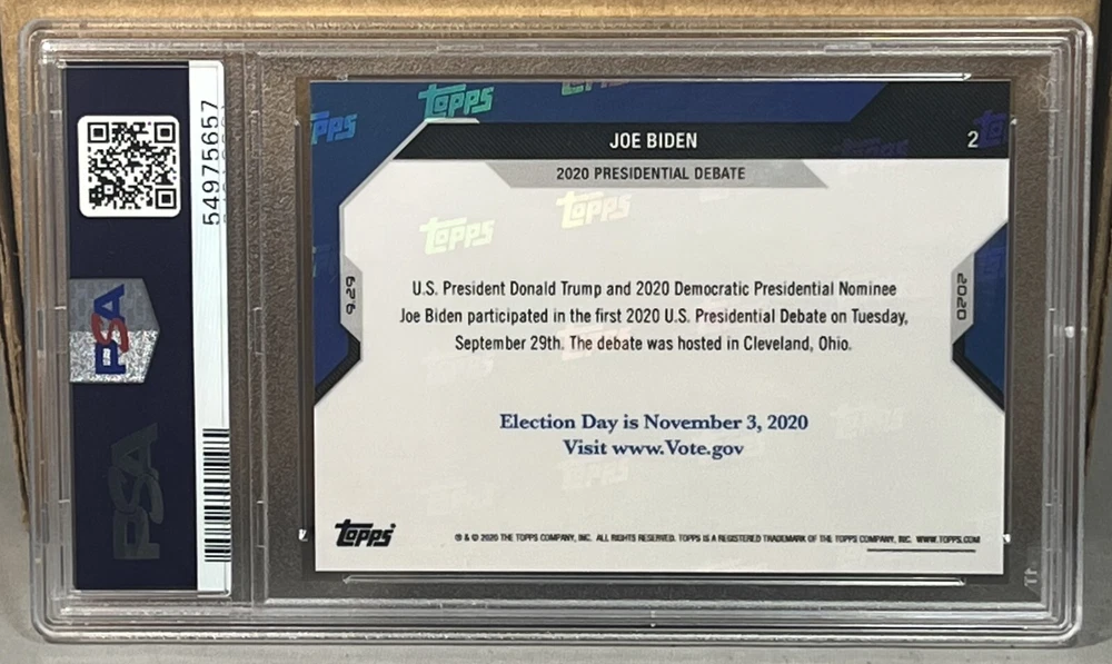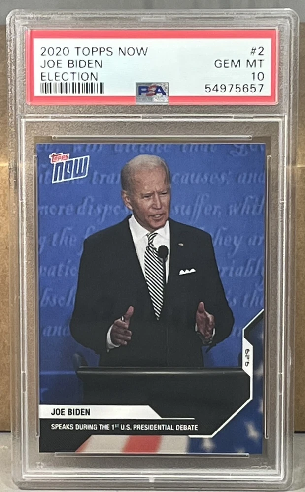 2020 TOPPS NOW ELECTION #2 JOE BIDEN PSA 10 GEM MINT speaks during the 1st U.S. Presidential Debate. PSA serial #54975657. Worldwide shipping available. U.S. - Winning bidder to add 4.99 for careful USPS first class insured shipping with delivery confirmation. Add .50 for each additional item. All other countries - ship costs are calculated by eBay through international shipping program. Please message if interested in multiple items. Bid with confidence, 49000+ feedback. Thanks and check out my auctions ending every Sunday. Please note that combined ship rates are for items paid for on one invoice, thanks!
