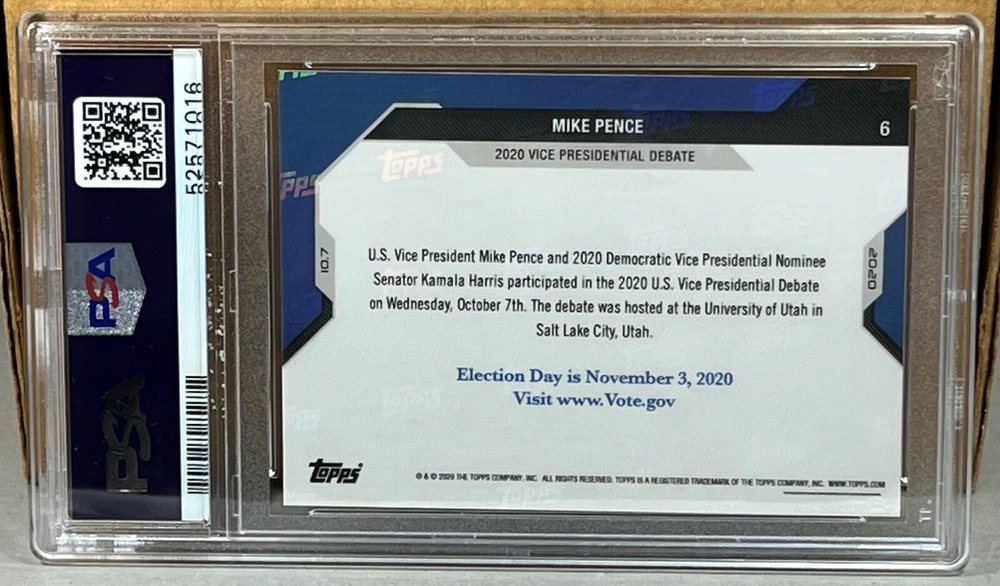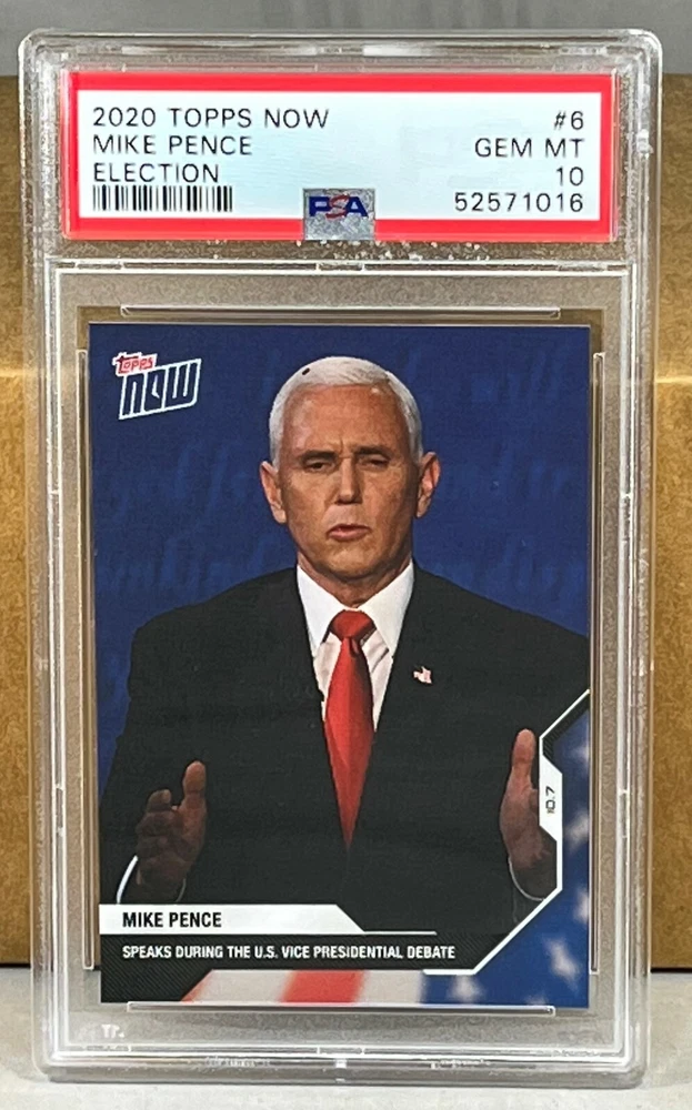 2020 TOPPS NOW ELECTION #6 MIKE PENCE PSA 10 GEM MINT speaks during the U.S. Vice Presidential Debate. PSA serial #52571016. Worldwide shipping available. U.S. - Winning bidder to add $3.99 for careful USPS first class shipping with delivery confirmation. Add .50 for each additional item. All other countries - Winning bidder to add $19.99 for careful USPS air mail shipping. Add $1 for each additional item. Bid with confidence, 49000+ feedback. Thanks and please see all of my auctions this week. Lots of PSA graded cards and etopps auctions for this week. I will be adding more PSA and etopps cards throughout the rest of the year, please subscribe to my store and check out all the cards. If you have not seen etopps cards before, they are cards originally offered online through their website. All cards come uncirculated in its own holder with an etopps seal and have a chrome/refractor look. Canada - Winning bidder to add $14.99 for careful USPS air mail shipping. Add $1 for each additional item. Please note that combined ship rates are for items paid for on one invoice, thanks!