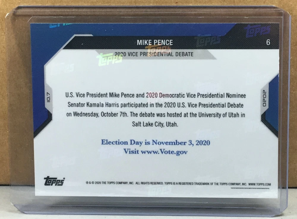 2020 TOPPS NOW USA Election #6 MIKE PENCE (and the fly!) speaks during the U.S. Vice Presidential Debate. The card pictured is the actual one you will receive. Worldwide shipping available. U.S. - Winning bidder to add $3.50 for careful USPS first class shipping with delivery confirmation. Add .50 for each additional item. Canada - Winning bidder to add $11.99 for careful USPS air mail shipping. Add $1 for each additional item. All other countries - Winning bidder to add $14.99 for careful USPS air mail shipping. Add $1 for each additional item. Bid with confidence, 49000+ feedback. Thanks and check out my auctions ending every Sunday. Over 800 items ending every Sunday featuring Topps Living singles, Topps Living week sets, Topps Living PSA, Topps Now singles, Topps Now PSA & Topps Project 2020 singles. Please note that combined ship rates are for items paid for on one invoice, thanks!