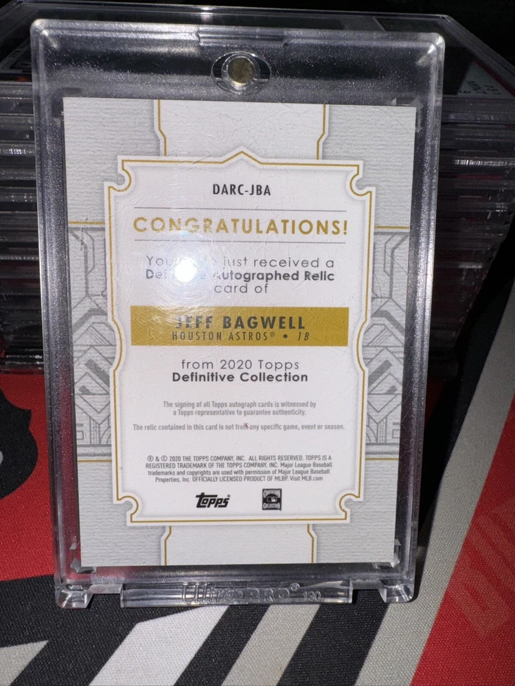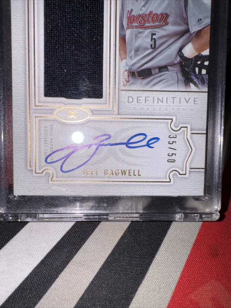 This is a rare and highly sought-after 2020 Topps Definitive Collection Definitive Autographed Relic Jeff Bagwell /50 trading card. The card is in excellent shape and has been well-maintained, ensuring its longevity and value. It is a great addition to any collection and is perfect for fans of Jeff Bagwell and sports trading cards alike. The card features a stunning autographed relic of Jeff Bagwell, making it a must-have for any serious collector. It is limited to only 50 copies, so you can be sure that this card will be a valuable addition to your collection for years to come. Don't miss out on this opportunity to own a piece of sports history!