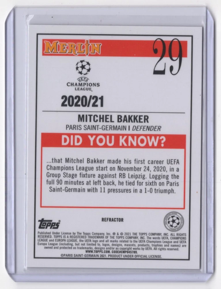 2020 Topps Merlin Chrome UEFA Champions Refractor Mitchel Bakker Rookie Paris