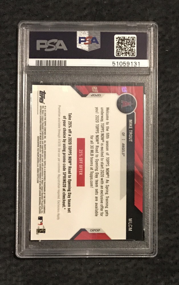 This is a 2020 Topps Now Road to Opening Day for Mike Trout, graded 10 by Professional Sports (PSA) and in GEM MT condition. The single-insert card features the Los Angeles Angels player and has card number #WLCM. It is an original and authentic card manufactured by Topps, a reputable card manufacturer. Perfect for baseball fans and collectors, this card is a great addition to any collection.