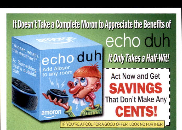 2020 Wacky Packages Weekly Series May Coupon Backs #20 Echo Duh - NM Echo Dot Front Back Sport: Non-sports Set: 2020 Topps Wacky Packages Weekly Series May Coupon Backs Year: 2020 Item#: 20 Manufacturer: Topps Co. Grading Company: Raw Grade SetType: Parallel Item Condition: Near Mint 2014 Beckett Collectibles, LLC. All Rights Reserved Powered by: MINOR LEAGUE SINGLES Minor League SINGLE cards are a fantastic way to pick up a nice card of your ex-teammate, coach, co-worker, relative, friend, high school classmate, boyfriend, or husband! Minor league singles are rarely seen. Getting minor league baseball cards autographed is fun, and as you may have experienced, players on minor league cards enjoy it when you ask them to sign their card, itââ¬â¢s a conversation piece! YOU ARE ONLY BUYING THE CARD LISTED IN THE TITLE. Consider that the value of regularly, mass-produced baseball cards (printing millions of each & every card) versus the RARER, scarcely-produced minor league baseball cards, which are many times limited to only 1000-2500 sets. The scarcity of Minor League cards keeps them truly unique and offers a great investment which is fun to own. ABOUT US Gearhart Enterprises, Inc. is a sports collectables business which enjoys many different avenues of collecting, buying and selling. Located in Rockford, Illinois, we specialize in Autographs and Single Minor League Baseball Cards. In addition to the above, we also have a nice inventory of NFL Programs, Full Tickets and Ticket Stubs, 2016 Garbage Pail Kids Disg-Race to the White House cards and a large inventory of Game Used Seats from the Hubert H. Humphrey Metrodome. Orders usually ship Mondays, Thursdays, and Saturdays. Occasionally a schedule change or Federal Holiday may alter that schedule. We are in a continual process of scanning and uploading singles that we have for sale and adding additional signed inventory as time allows. PAYMENTS Payment via PayPal is preferred, while PayPal Credit is ideal for your larger $$ purchases. Please Note: All Illinois customers must pay Illinois State Sales Tax. SHIPPING As a buyer, I enjoy getting my purchases quickly, so I offer United States Priority Mail. As you purchase Minor League singles, you will have two options for shipping. Option #1 is USPS first class package. If at the time of your purchase, you pay shipping on multiple cards and they are able to be shipped out in the same package Small Flat Rate Box, a prompt refund of any additional shipping via PayPal will be issued to you. Shipping option #2 is USPS Priority Mail Small Flat Rate Box. A tracking number is provided for BOTH Option #1 and Option #2. International Shipping is available, and pricing for shipping and handling varies based on location. IMAGES AND STOCK AVAILABILITY Images: Some card images are stock photos from the Beckett website. They are a representation of the actual card you will receive. Obviously, with any questions regarding a specific item, please feel free to ask. Stock Availability: We do our very best to ensure all items are in stock. Being human, however, a mistake could occur and cards may get lost in the short-term shuffle. In the unusual event that a card is unavailable, you will have options for a replacement card or a prompt refund. RETURNS AND CLAIMS We are committed to accuracy in our orders, and strive for perfection in our services, and yet it is possible that a mistake may occur. First, if you believe there is a problem with your purchase, please contact us as soon as possible, so we can rectify the problem and find a solution to make it right! Second, we offer a 14-day return policy because we want our buyers to be pleased with their purchases! If a return request is due to our error, we will pay to have the items returned. If a buyer decides to not keep the item for any reason or changes their mind, the buyer pays for the itemââ¬â¢s return shipping. FAQ's DO YOU OFFER IMAGES SHOWING THE BACK OF THE CARD? Many times, the back of the card will be shown in addition to the front of the card. DO YOU RECYCLE? Absolutely, we recycle common shipping supplies including: penny sleeves, top load holders, bubble mailers and/or shipping boxes. We also responsibly recycle end-of-life shipping supplies when they no longer look new or function properly. HOW FAST DO YOU SHIP OUT ORDERS? We ship 3x per week . . . Monday, Thursday, and Saturday . . . unless on vacation (rare, but hey, it can happen!), out of town for work, or if a shipping day falls on a Federal Holiday. Special arrangements can be made for shipping if needed. THANKS We leave +Positive+ feedback shortly after your items ship. Please let us know when your item(s) arrive and leave a 5 Star rating for our transaction! We appreciate each of our buyersââ¬â¢ business and support. We get a kick out of connecting people with cards, and it is a privilege to do what we love in offering these Minor League Singles. Thanks again and God Bless!