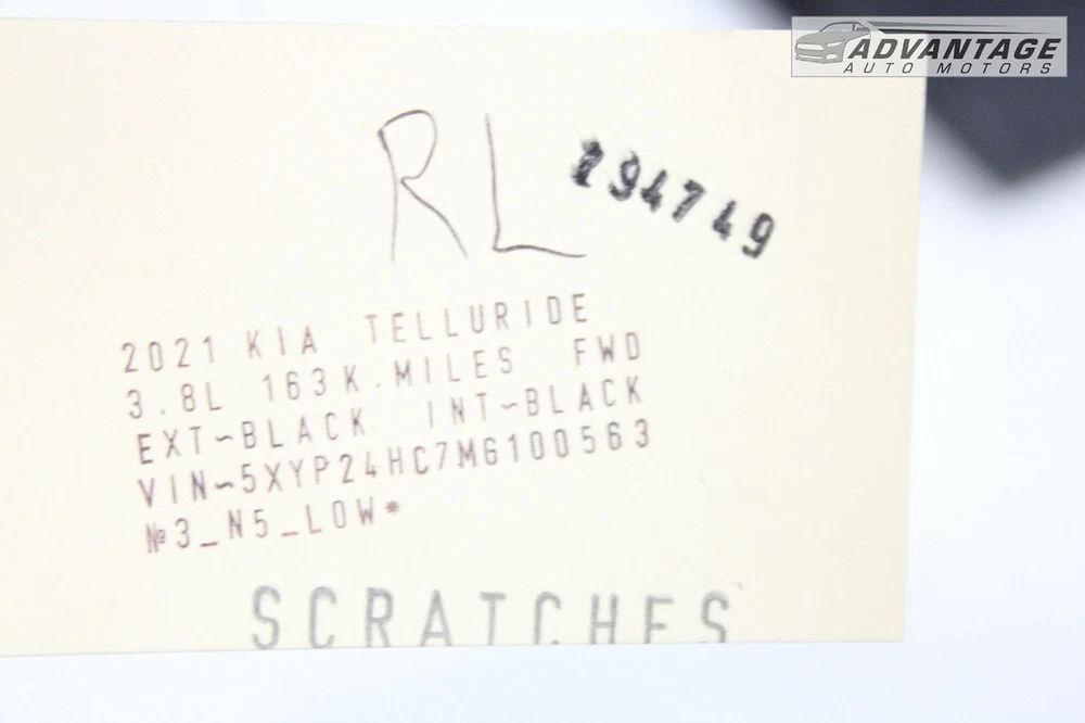 OUR STORE CONTACT US ABOUT US OUR FEEDBACK SALE ITEMS Categories 2021 ALFA ROMEO GIULIA 12K 2021 KIA TELLURIDE 163K.MILES 2018 LEXUS GS350 61K 2019 DODGE CHARGER 3.6L 105K 2018 TOYOTA COROLLA 151K 2021 DODGE CHALLENGER 3.6L 39K 2018 KIA STINGER 2.0L 112K 2019 LINCOLN NAUTILUS 2.7L 52K 2021 FORD F-150 2.7L 30K 2021 KIA K5 GT-LINE RED 30K 2022 KIA K5 LXS 80K 2021 NISSAN VERSA SV 28K 2019 CHEVY BLAZER FWD 45K 2018 VOLKSWAGEN TIGUAN 167K 2016 BMW 330E 2.0L RWD 172K 2019 SUBARU LEGACY 2.5L 198K 2022 HONDA PILOT 3.5L 49K 2018 TOYOTA COROLLA IM 185K 2016 MERCEDES-BENZ CLA250 56K 2019 SUBARU WRX 70K 2018 BMW 740I 3.0L 81K 2018 TOYOTA PRIUS PRIME 50K 2018 AUDI A5 2.0L 92K 2021 MITSUBISHI OUTLANDER 85K 2003 HUMMER H2 6.0L 103K 2016 PORSCHE MACAN S 3.0L 96K 2020 NISSAN SENTRA 2.0L 93K 2019 GENESIS G70 2.0L 80K. 2018 AUDI Q5 2.0L 80K 2023 HONDA CIVIC 18K MILES Item: Donor: DONOR VEHICLE: 2021 KIA TELLURIDE LX ENGINE: 3.8L V6 DOHC 24V GDI (LAMBDA II) GAS TRANSMISSION: 8-SPEED AUTOMATIC (A8LF1) DRIVE TYPE: FRONT WHEEL DRIVE (FWD) BODY TYPE: SPORT UTILITY 4-DOOR (SUV) MILEAGE: 163K MILES COLOR: EXTERIOR COLOR: EBONY BLACK (EB) INTERIOR COLOR/TRIM: BLACK / LEATHER (WK) VIN NUMBER: 5XYP24HC7MG100563 SHIPPING RETURN WARRANTY FREE SHIPPING ONLY EXTENDED TO SMALLSPARE PARTS. DELIVERY FOR PARTS LIKE: ENGINE, TRANSMISSION,DOOR, HOOD, BUMPER, AND OTHER LARGE PARTS WILL BE SPECIFIED IN THE DESCRIPTION. FLAT RATE FREIGHT SHIPPING PRICES GENERATED BY EBAY ARE FOR COMMERCIALLY ZONED ADDRESSES ONLY WHICH HAVE A DOCK OR FORKLIFT AVAILABLE AND CAN ACCOMODATE UP TO A SEMI-TRUCK. INTERNATIONAL SHIPPING: DELIVERY COST TO ALASKA, HAWAI,PUERTO RICO AND GUAM $ 50 (SMALL SPARE PARTS). IF YOU WANT TOPURCHASE LARGE SPAREPARTS, PLEASE CONTACT US BEFORE YOU PURCHASE FOR SHIPPING COST. DELIVERY ABROAD IS ALSO POSSIBLE.CONTACT US TO FIND OUT THE PRICE AND TIME OF DELIVERY. EXPEDITE SHIPPING: IF YOU URGENTLY NEED SPARE PARTS, WE CAN SEND US USING OVERNIGHTOR 2 DAYS DELIVERY. CONTACT USAND WE WILL PROVIDE YOU WITH EXACT SHIPPING COST. WE HAVE A 30 DAY RETURN POLICY. BUYER PAYS RETURN SHIPPING IFREASON FOR RETURN: 1- ORDERED BY MISTAKE; 2- CHANGE MY MIND; 3- FIND THE BEST PRICE; 4- SPARE PARTS NOT FIT; 5- JUST DO NOT LIKE IT. IF THE BUYER HAS RETURNED THE PRODUCT AND THE PART NUMBERS DONOT MATCH THE NUMBERS ON THE PHOTOSOR HAS RETURNED THE SPARE PARTS WITH DAMAGES OR THE BUYER OPENED THE PART, THENACCORDING eBayRULES, THE SELLER HAS THE RIGHT TO CHARGE 50% OF THE PRICE OF THE PRODUCT WE HAVE 30 DAYS WARRANTY ON ENGINES, TRANSMISSIONS, TRANSFERCASES AND DIFFERENTIALS. NO LABOR COST REIMBURSEMENT.