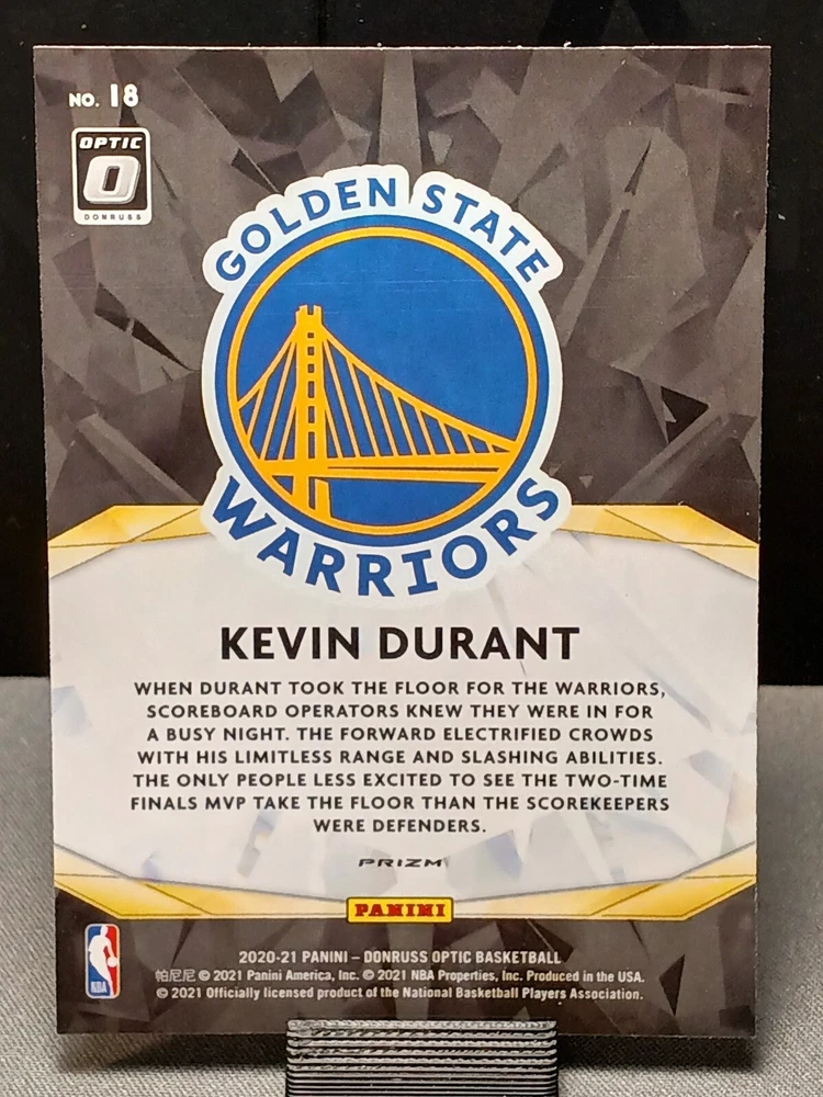 This 2020-21 Panini Donruss Optic sports trading card features Kevin Durant, player for the Golden State Warriors and Team USA, in a Winner Stays insert set. The card is made of 20 Pt. card stock, with a purple prizm parallel/variety, and has a hologram, short print, and insert feature. It is an original card, not a licensed reprint, and is part of the National Basketball Association (NBA) league. The card number is 18 and it was manufactured in the United States by Panini. This card is perfect for any basketball fan, especially those who follow Kevin Durant or the Golden State Warriors. It is a great addition to any sports trading card collection and would make a fantastic gift. Get this unique card today and add it to your collection!