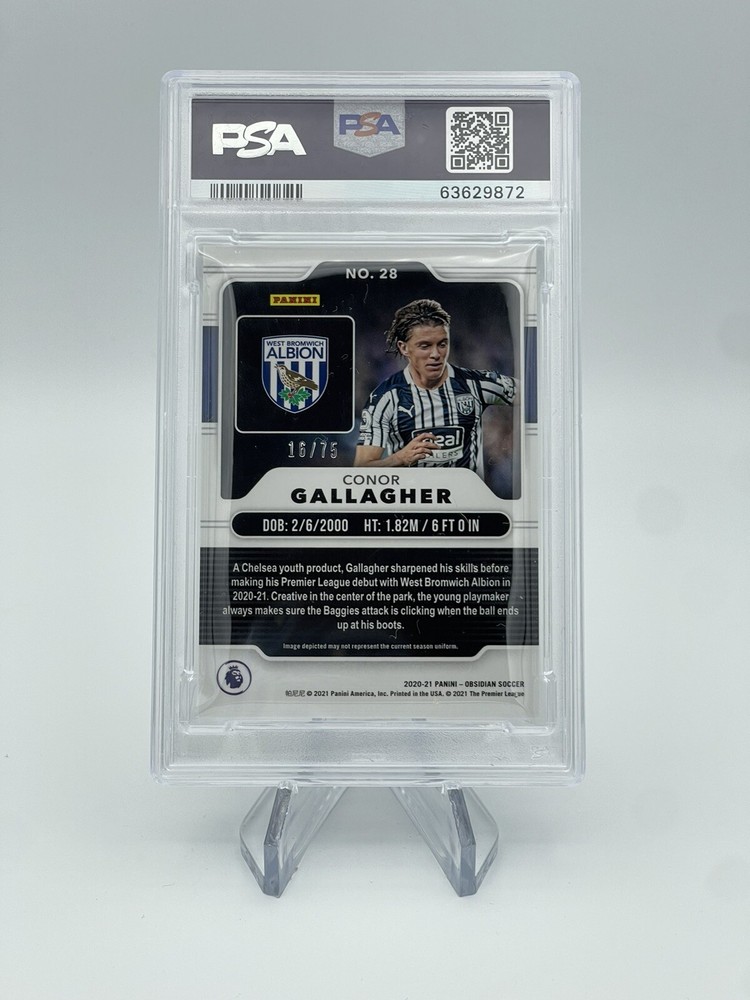 This rare and highly sought-after 2020-21 Panini Obsidian Soccer card features Conor Gallagher, a promising talent for the Premier League. The card is a stunning Electric Etch Purple Parallel, numbered out of 75, and is sure to impress any collector. The card is also serial numbered, making it a unique addition to any collection. This card is a must-have for fans of Gallagher's clubs, including Crystal Palace, West Bromwich Albion, and Chelsea, as well as those who appreciate the artistry of Panini's Obsidian set. Manufactured in the United States, this card is a true gem for any soccer enthusiast. Don't miss your chance to own this card today! GRADE: PSA 10 SERIAL #: 16/75 SHIPS FAST FROM CALIFORNIA! ATLETICO MADRID, CHELSEA, WEST BROM ALBION, CRYSTAL PALACE, ENGLAND NATIONAL TEAM