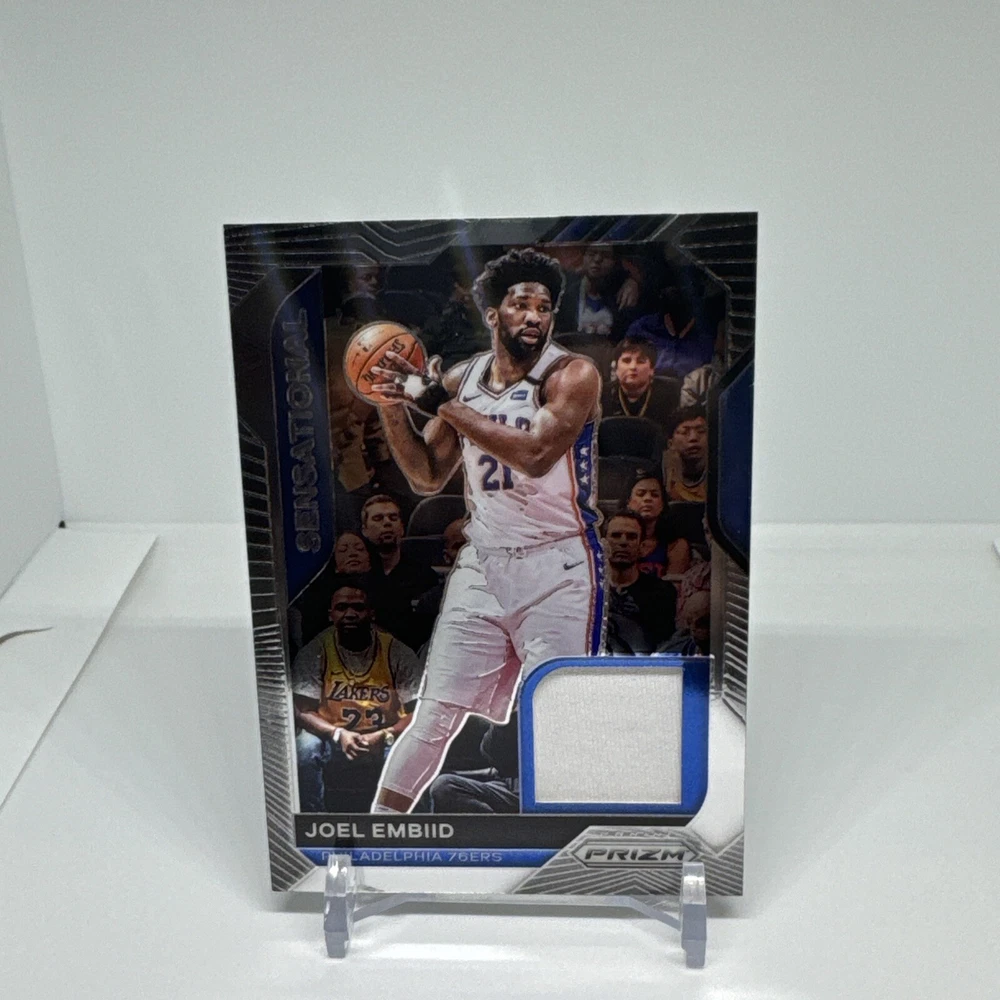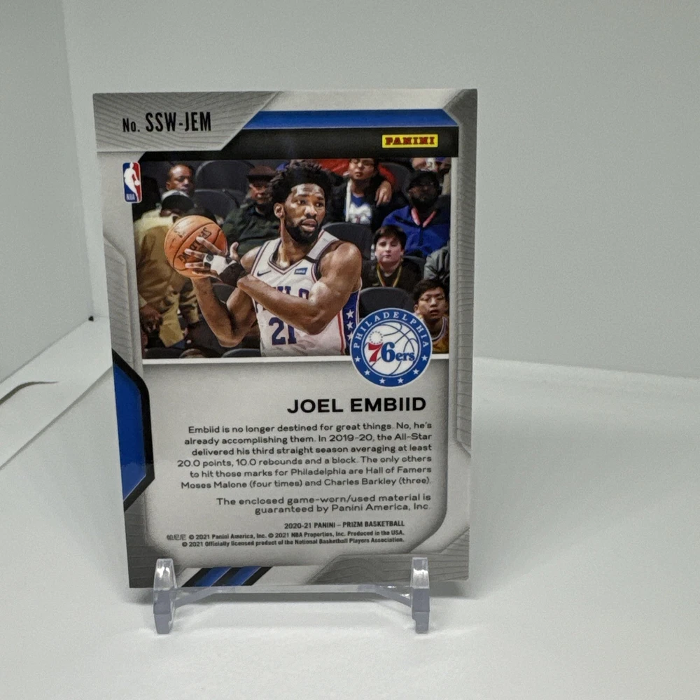This 2020-21 Panini Prizm trading card features Philadelphia 76ers' star Joel Embiid in a Sensational Game Used Memorabilia card. The card is from the National Basketball Association (NBA) league and is perfect for basketball enthusiasts and collectors. The card number is SSW-JEM and it is a near mint or better conditioned card. The card is manufactured by Panini and is part of the 2020-21 set. It is a sports trading card that features Embiid's memorabilia from a game. This card is a must-have for any collector or fan of the Philadelphia 76ers or basketball in general.