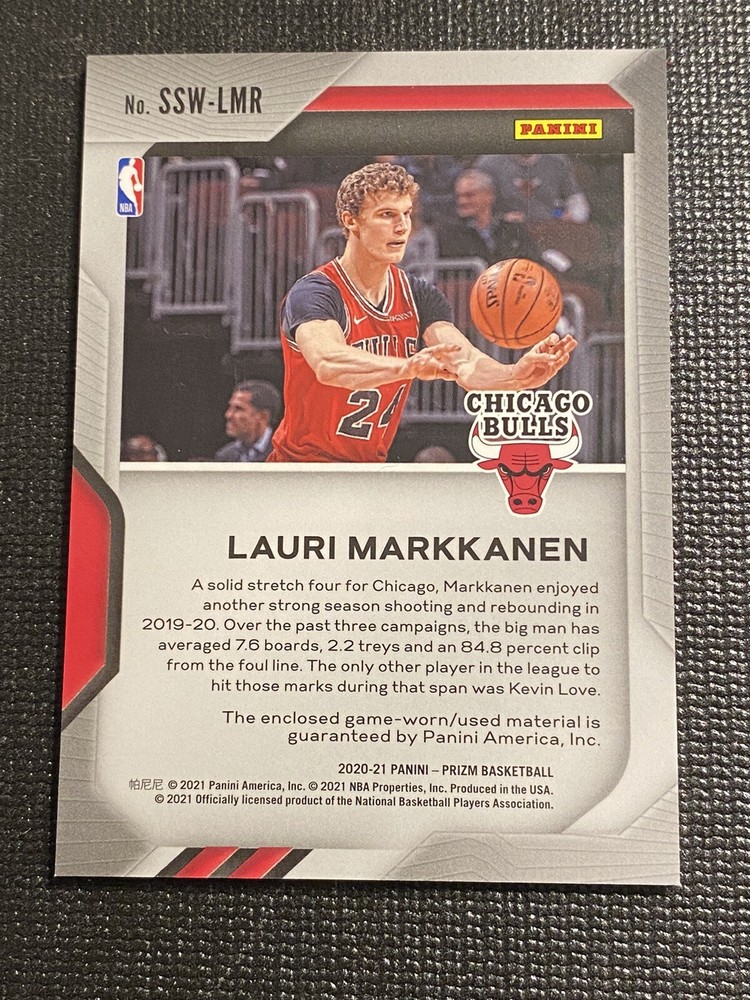 2020-21 Panini Prizm Lauri Markkanen Sensational #SSW-LMR Game Worn Jersey Card. Ships in bubble mailer with tracking via USPS Ground Advantage in penny sleeve, top loader and protected by cardboard for a set fee for shipping and handling.