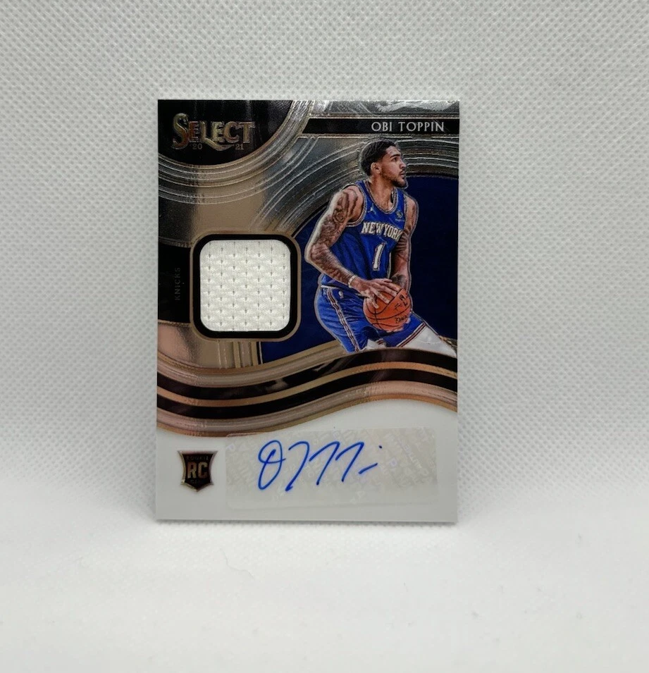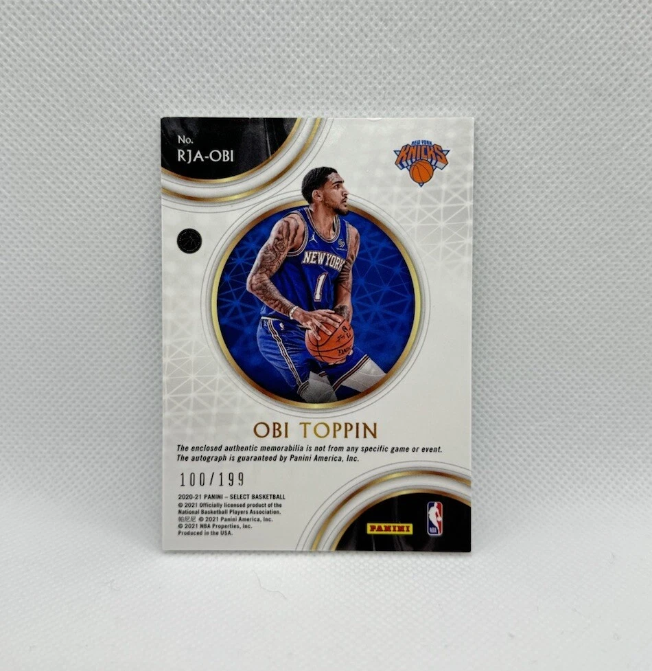 This 2020-21 Panini Select Basketball card features Obi Toppin of the New York Knicks, with a limited edition auto patch and serial number 100/199. This exclusive card is a must-have for any sports trading card collector, especially those who enjoy basketball and the National Basketball Association (NBA). The card is in excellent shape and has been well-preserved, ready to be added to your collection. With its rookie status, insert design, and memorabilia feature, this card is sure to be a standout in your collection. Don't miss out on this opportunity to own a piece of NBA history.