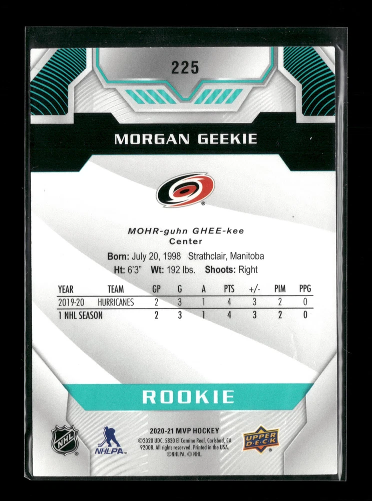 This listing is for 2020-21 Upper Deck MVP #225 Morgan Geekie . Rookie Excellent Carolina Hurricanes RC Please feel free to request more images with the penny sleeve removed. I will try to respond with-in 24 hours with the image requests in most cases. All single cards will come in protective cases. If you purchase a listing that's sold as a lot it may come in a team bag with multiple cards in a oversized toploader or card saver, and not all cards will be individually top loaded in all lots. I offer combined shipping so please feel free to contact me if you wish to purchase multiple cards and I will do my best to keep costs down. I can send an invoice so that we can agree on prices and shipping. I do not like to pay excessive shipping costs when I buy items and I will not do that to any buyers. *Cards are scanned using a High Resolution scanner, and are scanned with a penny sleeve on them so they are protected from getting scratched/damaged during the scanning process. Light scratches that are seen on the scans are on typically on the penny sleeve not the card in most cases. *Chrome cards (Topps Chrome/Prizm/Optic/Mosaic) might have minor light surface scratches which is typical with these type of cards. Any major deep scratches will be stated if any are present. * Chrome, Prisim, XFractor, Refractors may look darker. This is due to the scanning of the card and not camera pictures. Please check out our other listings for more great cards. Thank you. Steve
