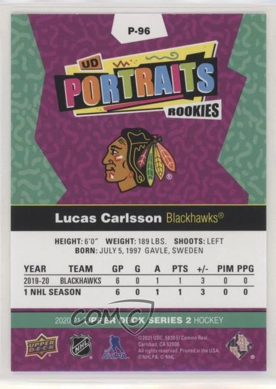 2020-21 Upper Deck - UD Portraits #P-96 Rookies - Lucas Carlsson - Rookie - Ice Hockey Card - Featuring the Chicago Blackhawks - Featuring Lucas Carlsson Search for more: 2020-21 Upper Deck Search for more: 2020-21 Upper Deck - UD Portraits View all of our Listings Auctions Buy It Now About Us Located in the beautiful Pacific Northwest, COMC (Check Out My Cards) is the world's largest consignment service for trading card singles. More than 10,000 people have used our consignment service to list over 50 million trading cards. Find out how we can help you consign your items on eBay by contacting us through eBay messaging. COMC -- "The Safe & Easy Way to Buy & Sell" Representative Image - Select Specific Item above to see image of actual item Representative Image - Select Specific Item above to see image of actual item Raw Condition for Modern Cards Unless otherwise noted, raw modern cards are listed in Near Mint-Mint condition or better. A NM-MT card appears to be Mint at first glance, but upon closer inspection, may exhibit some of the following: minor print defects (e.g. roller marks, print line, dimple), minor scratches, slight edge wear, and slight corner wear. Centering is clearly visible in the images provided and does not factor into our condition assessment. Raw Condition for Vintage Cards Unless otherwise noted, raw vintage cards are listed in Excellent condition or better. An EX card may exhibit some of the following: minor rounding of corners, surface wear, print defects, light scratches, and slight edge wear/chipping. Centering is clearly visible in the images provided and does not factor into our condition assessment. Domestic Shipping Combined shipping for multiple items is available. To receive combined shipping, please ensure all desired items are in your eBay shopping cart before proceeding to checkout. eBay limits orders to 40 items per order. We automatically combine multiple orders placed on the same day. If you place multiple orders on the same day, please contact us to request a refund of applicable shipping costs. Signature confirmation may be required on invoices over $400. All cards are protected and shipped securely. International Shipping COMC offers eBay's International Shipping (EIS) for international orders under $2,500* (see country exceptions below). All duties and import fees are paid at checkout; in the rare event that there are additional import fees upon delivery, these are borne by the buyer. EIS packages route through a shipping hub in Erlanger, KY before shipping to their final destination. Please note that EIS does not allow for combined shipments. The shipping rates are determined by eBay and cannot be adjusted. *Maximum sale price exceptions: Colombia, Kuwait ($2,000); Taiwan ($1,539); Chile, Costa Rica, Guatemala, Honduras, Trinidad and Tobago ($1,000); Antigua and Barbuda, Aruba, Belize, Dominica, Grenada, Philippines, Saint Kitts and Nevis, Saint Lucia, Montserrat, Turks and Caicos Islands ($500); Dominican Republic, El Salvador ($200). Please request a shipping quote through eBay messaging for orders that exceed the maximum sale price supported by eBay's International Shipping. You will be responsible for all duties and import fees for international orders shipped outside the EIS. All cards are protected and shipped securely. Payment COMC does not accept offers on our cards through our eBay storefront. COMC utilizes eBay’s managed payments system. If you are experiencing difficulties making a payment, please contact eBay for assistance. Return Policy Returns are only accepted on the rare occasion the item is not as described. If you are making a return, please initiate the return process through eBay so a mailing label can be provided for you. Prior to listing, our expert team carefully assessed this item to represent it accurately. Please review the description and high-definition images prior to purchasing to ensure this item meets your satisfaction. We welcome you to contact us if you have further questions about this item. Trust and Integrity COMC carefully assesses each item consigned to us to prevent fraudulent items from entering the marketplace. If you believe an item offered on COMC may be fraudulent, please contact us with details so we can investigate the issue. Items we determine are outside our supported items policy may be removed. Last Modified: 2/1/2025 8:59:01 AM PDT