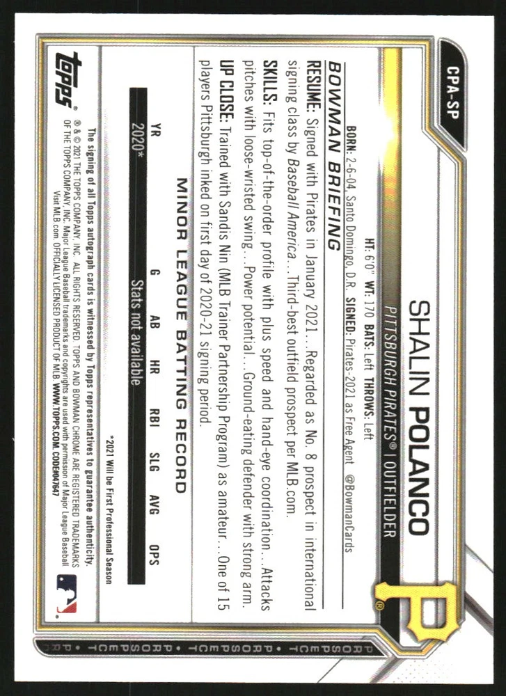 2021 Bow Chrome Prospect Autographs Speckle Refractors #CPASP Shalin Polanco/299 Front Back Sport: Baseball Set: 2021 Bowman Chrome Prospect Autographs Speckle Refractors Year: 2021 Item#: CPASP Player: Shalin Polanco Team: Pittsburgh Pirates Attributes: Autograph, Serial Numbered Brand: Bowman Chrome Manufacturer: Topps Co. Grading Company: Raw Grade SetType: Parallel Insert Item Condition: Near Mint/Mint 2014 Beckett Collectibles, LLC. All Rights Reserved Powered by: Thank you for choosing Burbank Sportscards, the sports cards superstore. We offer a large selection of singles across all sports. Visit our ebay store to view all our items available. Our Shipping Policy We offer Free Standard Shipping to all Domestic customers. Options for Expedited shipping are also available at checkout. For our international customers, shipping is $9.99 for the first item, and $0.25 for each additional item. Note to all customers: To qualify for combines shipping, we ask our customers to add items into the shopping cart. Please note, we do not combine orders that are placed separately. Our Service: Generally, our turnaround is super quick as we process and send out orders same day payment is received. Stock Availability: We do our best to ensure all items are in stock; however, in case of the rare stock out, the customer will have the option for a replacement card, or we will process a refund so the order is not held up. Our Images: Many of our images are stock photos from Beckett archives. They are a representation of the actual card you would receive. If you have any questions regarding the item you're interested in, please feel free to ask (serial numbers and relic pieces may vary) Moreover, in a case of a wrong or defective photo, please notify us, so we can adjust it. Other FAQ's: -When buying multiple cards, do you top load each item? No; however, we do try to insure all items are shipped securely. If you wish to have all of your cards top loaded it is a paid service and can be arranged. Please email for more details. For other questions, please feel free to ask. Thank you.