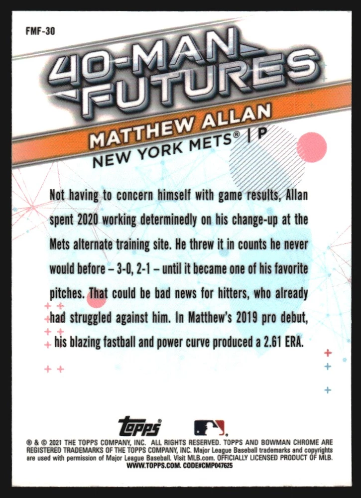 2021 Bowman Chrome 40-Man Futures Refractors #FMF30 Matthew Allan Front Back Sport: Baseball Set: 2021 Bowman Chrome 40-Man Futures Refractors Year: 2021 Item#: FMF30 Player: Matthew Allan Team: New York Mets Brand: Bowman Chrome Manufacturer: Topps Co. Grading Company: Raw Grade SetType: Insert Item Condition: Near Mint/Mint 2014 Beckett Collectibles, LLC. All Rights Reserved Powered by: Thank you for choosing Burbank Sportscards, the sports cards superstore. We offer a large selection of singles across all sports. Visit our ebay store to view all our items available. Our Shipping Policy We offer Free Standard Shipping to all Domestic customers. Options for Expedited shipping are also available at checkout. For our international customers, shipping is $9.99 for the first item, and $0.25 for each additional item. Note to all customers: To qualify for combines shipping, we ask our customers to add items into the shopping cart. Please note, we do not combine orders that are placed separately. Our Service: Generally, our turnaround is super quick as we process and send out orders same day payment is received. Stock Availability: We do our best to ensure all items are in stock; however, in case of the rare stock out, the customer will have the option for a replacement card, or we will process a refund so the order is not held up. Our Images: Many of our images are stock photos from Beckett archives. They are a representation of the actual card you would receive. If you have any questions regarding the item you're interested in, please feel free to ask (serial numbers and relic pieces may vary) Moreover, in a case of a wrong or defective photo, please notify us, so we can adjust it. Other FAQ's: -When buying multiple cards, do you top load each item? No; however, we do try to insure all items are shipped securely. If you wish to have all of your cards top loaded it is a paid service and can be arranged. Please email for more details. For other questions, please feel free to ask. Thank you.